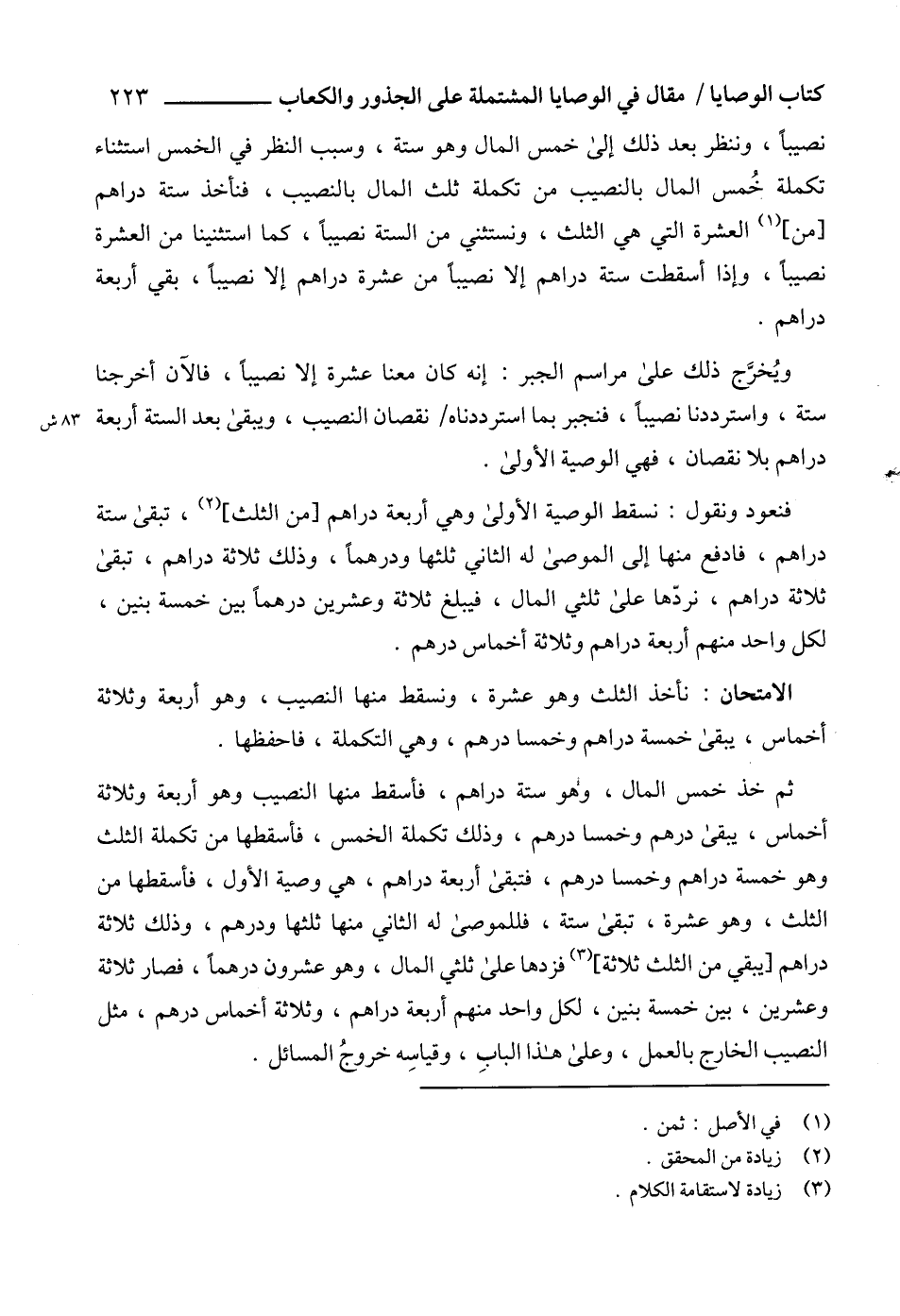 ثم خذ خمس المال، وهو ستة دراهم، فأسقط منها النصيب وهو أربعة وثلاثة أخماس، يبقى درهم وخمسا درهم، وذلك تكملة الخمس، فأسقطها من تكملة الثلث وهو خمسة دراهم وخمسا درهم، فتبقى أربعة دراهم، هي وصية الأول، فأسقطها من الثلث، وهو عشرة، تبقى ستة، فللموصى له الثاني منها ثلثها ودرهم، وذلك ثلاثة دراهم [يبقي من الثلث ثلاثة] (3) فزدها على ثلثي المال، وهو عشرون درهماً، فصار ثلاثة وعشرين، بين خمسة بنين، لكل واحد منهم أربعة دراهم، وثلاثة أخماس درهم، مثل النصيب الخارج بالعمل، وعلى هذا البابِ، وقياسِه خروجُ المسائل.