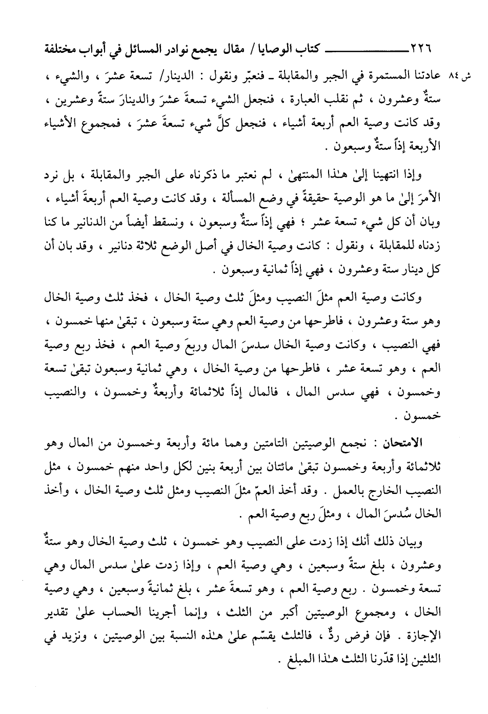 وكانت وصية العم مثلَ النصيب ومثلَ ثلث وصية الخال، فخذ ثلث وصية الخال وهو ستة وعشرون، فاطرحها من وصية العم وهي ستة وسبعون، تبقى منها خمسون، فهي النصيب، وكانت وصية الخال سدسَ المال وربعَ وصية العم، فخذ ربع وصية العم، وهو تسعة عشر، فاطرحها من وصية الخال، وهي ثمانية وسبعون تبقى تسعة وخمسون، فهي سدس المال، فالمال إذاً ثلاثمائة وأربعةٌ وخمسون، والنصيب خمسون.