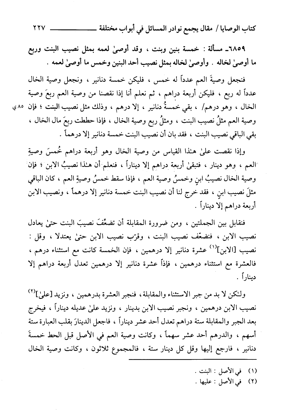 ولكن لا بد من جبر الاستثناء والمقابلة، فنجبر العشرة بدرهمين، ونزيد [على] (2) نصيب الابن درهمين، ونجبر نصيب الابن بدينار، ونزيد على عديله ديناراً، فيخرج بعد الجبر والمقابلة ستة دراهم تعدل أحد عشر ديناراً، فاجعل الدينارَ بقلب العبارة ستة أسهم، والدرهم أحد عشر سهماً، وكانت وصية العم في الأصل قبل الحط خمسةَ دنانير، فارجع إليها وقل كل دينار ستة، فالمجموع ثلاثون، وكانت وصية الخال