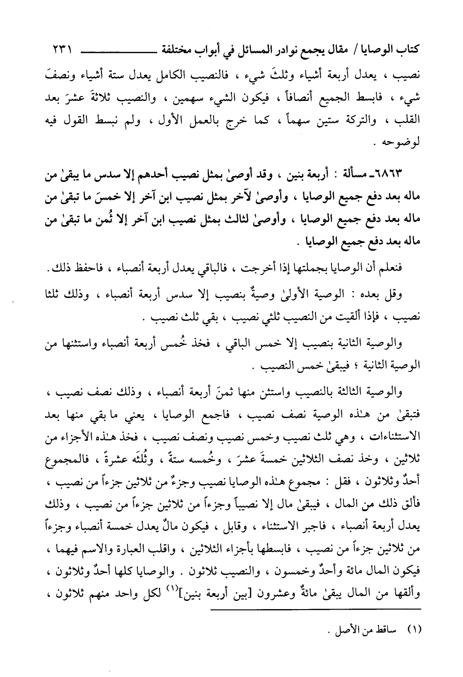 والوصية الثالثة بالنصيب واستثن منها ثمنَ أربعة أنصباء، وذلك نصف نصيب، فتبقى من هذه الوصية نصف نصيب، فاجمع الوصايا، يعني ما بقي منها بعد الاستثناءات، وهي ثلث نصيب وخمس نصيب ونصف نصيب، فخذ هذه الأجزاء من ثلاثين، وخذ نصف الثلاثين خمسةَ عشرَ، وخُمسه ستةً، وثُلثَه عشرةً، فالمجموع أحدٌ وثلاثون، فقل: مجموع هذه الوصايا نصيب وجزءٌ من ثلاثين جزءاً من نصيب، فألق ذلك من المال، فيبقى مال إلا نصيباً وجزءاً من ثلاثين جزءاً من نصيب، وذلك يعدل أربعة أنصباء، فاجبر الاستثناء، وقابل، فيكون مالٌ يعدل خمسة أنصباء وجزءاً من ثلاثين جزءاً من نصيب، فابسطها بأجزاء الثلاثين، واقلب العبارة والاسم فيهما، فيكون المال مائة وأحدٌ وخمسون، والنصيب ثلاثون. والوصايا كلها أحدٌ وثلاثون، وألقها من المال يبقى مائةٌ وعشرون [بين أربعة بنين] (1) لكل واحد منهم ثلاثون،