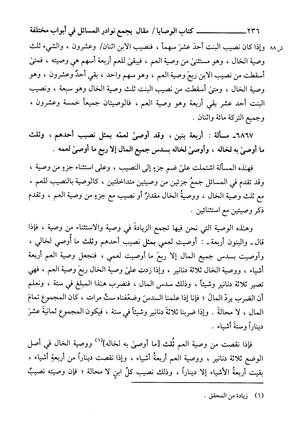 فهذه المسألة اشتملت على ضم جزءٍ إلى النصيب، وعلى استثناء جزءٍ من وصية، وقد تقدم في المسائل جمعُ جزئين من وصيتين متداخلتين، كالوصية بالنصيب للعم، مع ثلث وصية الخال، ووصيةُ الخال مقدارٌ أو نصيب مع جزءٍ من وصية العم، وتقدم ذكر وصيتين مع استثنائين.