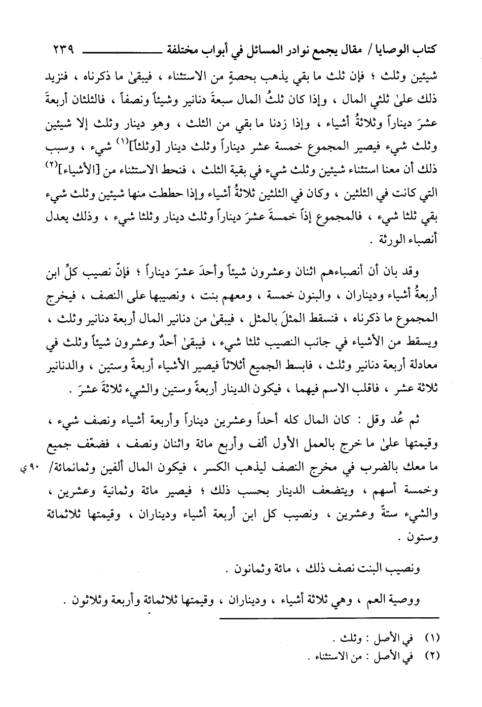 شيئين وثلث؛ فإن ثلث ما بقي يذهب بحصةٍ من الاستثناء، فيبقى ما ذكرناه، فنزيد ذلك على ثلثي المال، وإذا كان ثلثُ المال سبعةَ دنانير وشيئاً ونصفاً، فالثلثان أربعةَ عشرَ ديناراً وثلاثةُ أشياء، وإذا زدنا ما بقي من الثلث، وهو دينار وثلث إلا شيئين وثلث شيء فيصير المجموع خمسة عشر ديناراً وثلث دينار [وثلثا] (1) شيء، وسبب ذلك أن معنا استثناء شيئين وثلث شيء في بقية الثلث، فنحط الاستثناء من [الأشياء] (2) التي كانت في الثلثين، وكان في الثلثين ثلاثةُ أشياء وإذا حططت منها شيئين وثلث شيء بقي ثلثا شيء، فالمجموع إذاً خمسةَ عشرَ ديناراً وثلث دينار وثلثا شيء، وذلك يعدل أنصباء الورثة.