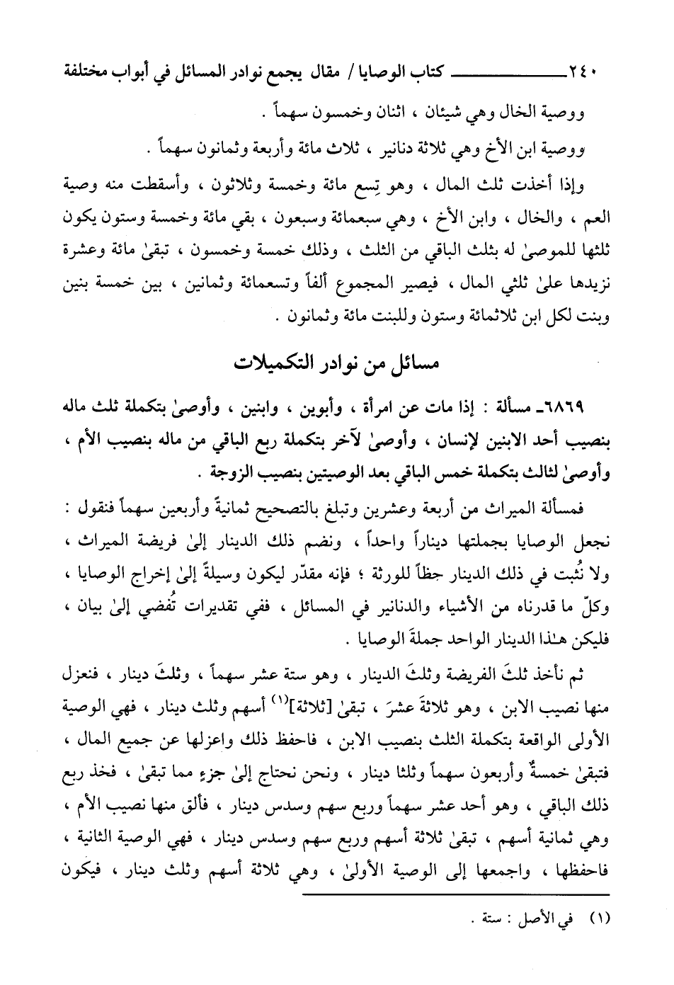 ووصية ابن الأخ وهي ثلاثة دنانير، ثلاث مائة وأربعة وثمانون سهماً.