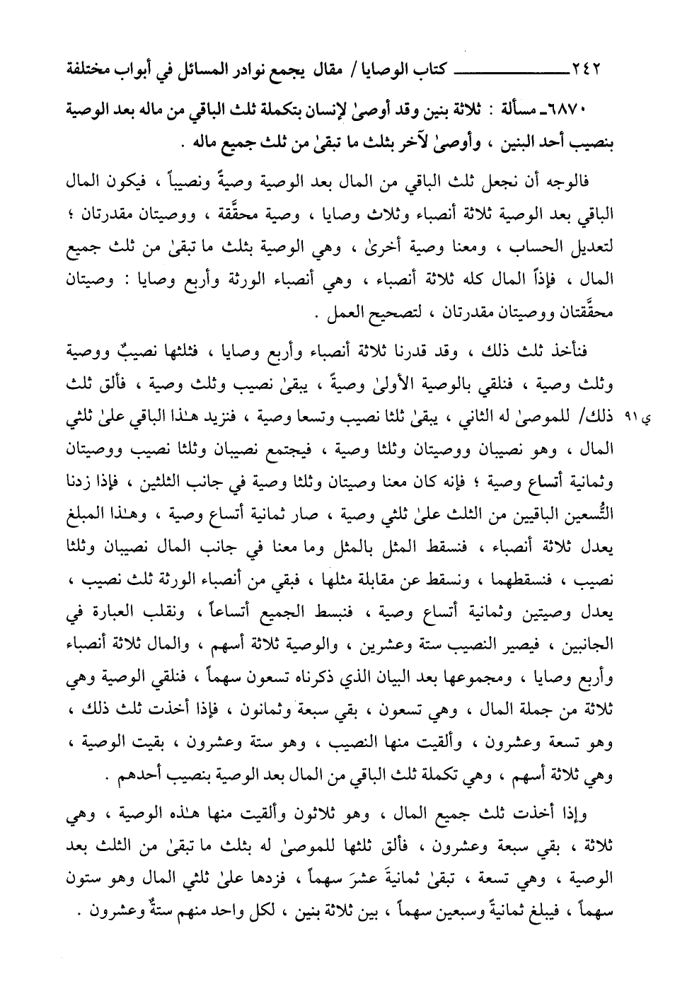 فنأخذ ثلث ذلك، وقد قدرنا ثلاثة أنصباء وأربع وصايا، فثلثها نصيبٌ ووصية وثلث وصية، فنلقي بالوصية الأولى وصيةً، يبقى نصيب وثلث وصية، فألق ثلث ذلك للموصى له الثاني، يبقى ثلثا نصيب وتسعا وصية، فنزيد هذا الباقي على ثلثي المال، وهو نصيبان ووصيتان وثلثا وصية، فيجتمع نصيبان وثلثا نصيب ووصيتان وثمانية أتساع وصية؛ فإنه كان معنا وصيتان وثلثا وصية في جانب الثلثين، فإذا زدنا التُّسعين الباقيين من الثلث على ثلثي وصية، صار ثمانية أتساع وصية، وهذا المبلغ يعدل ثلاثة أنصباء، فنسقط المثل بالمثل وما معنا في جانب المال نصيبان وثلثا نصيب، فنسقطهما، ونسقط عن مقابلة مثلها، فبقي من أنصباء الورثة ثلث نصيب، يعدل وصيتين وثمانية أتساع وصية، فنبسط الجميع أتساعاً، ونقلب العبارة في الجانبين، فيصير النصيب ستة وعشرين، والوصية ثلاثة أسهم، والمال ثلاثة أنصباء وأربع وصايا، ومجموعها بعد البيان الذي ذكرناه تسعون سهماً، فنلقي الوصية وهي ثلاثة من جملة المال، وهي تسعون، بقي سبعة وثمانون، فإذا أخذت ثلث ذلك، وهو تسعة وعشرون، وألقيت منها النصيب، وهو ستة وعشرون، بقيت الوصية، وهي ثلاثة أسهم، وهي تكملة ثلث الباقي من المال بعد الوصية بنصيب أحدهم.