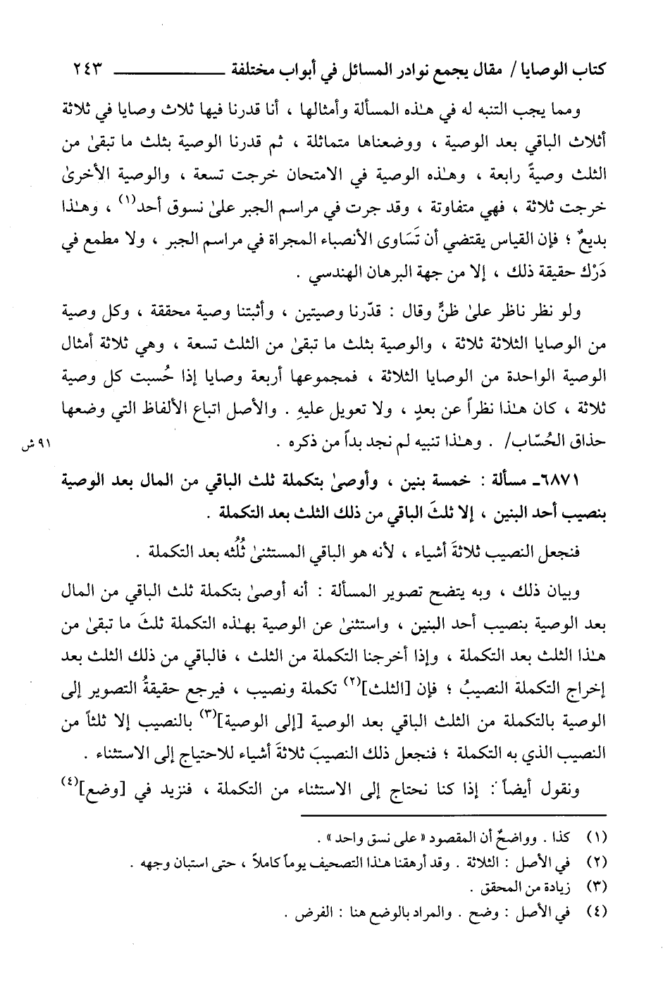 ومما يجب التنبه له في هذه المسألة وأمثالها، أنا قدرنا فيها ثلاث وصايا في ثلاثة أثلاث الباقي بعد الوصية، ووضعناها متماثلة، ثم قدرنا الوصية بثلث ما تبقى من الثلث وصية رابعة، وهذه الوصية في الامتحان خرجت تسعة، والوصية الأخرى خرجت ثلاثة، فهي متفاوتة، وقد جرت في مراسم الجبر على نسوق أحد (1)، وهذا بديعٌ؛ فإن القياس يقتضي أن تَسَاوى الأنصباء المجراة في مراسم الجبر، ولا مطمع في دَرْك حقيقة ذلك، إلا من جهة البرهان الهندسي.