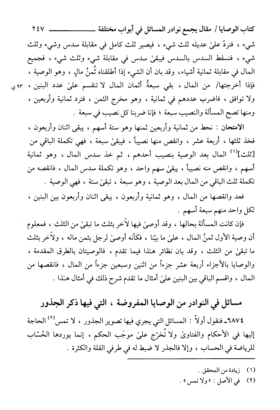 مسائل في النوادر من الوصايا المفروضة، التي فيها ذكر الجذور