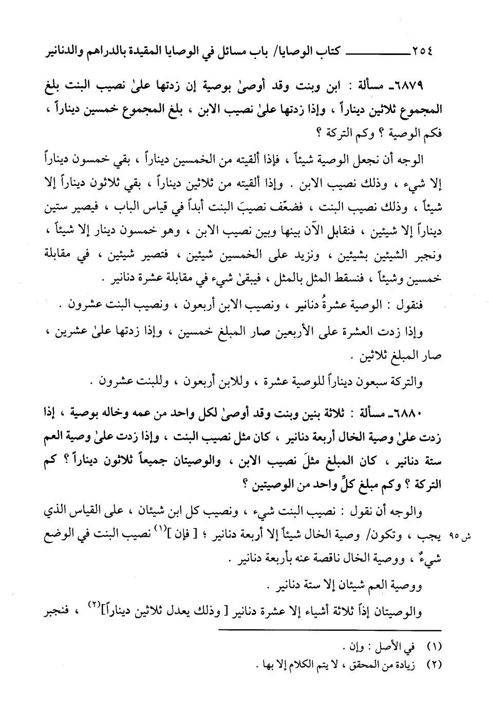 6879 - مسألة: ابن وبنت وقد أوصى بوصية إن زدتها على نصيب البنت بلغ المجموع ثلاثين ديناراً، وإذا زدتها على نصيب الابن، بلغ المجموع خمسين ديناراً، فكم الوصية؟ وكم التركة؟