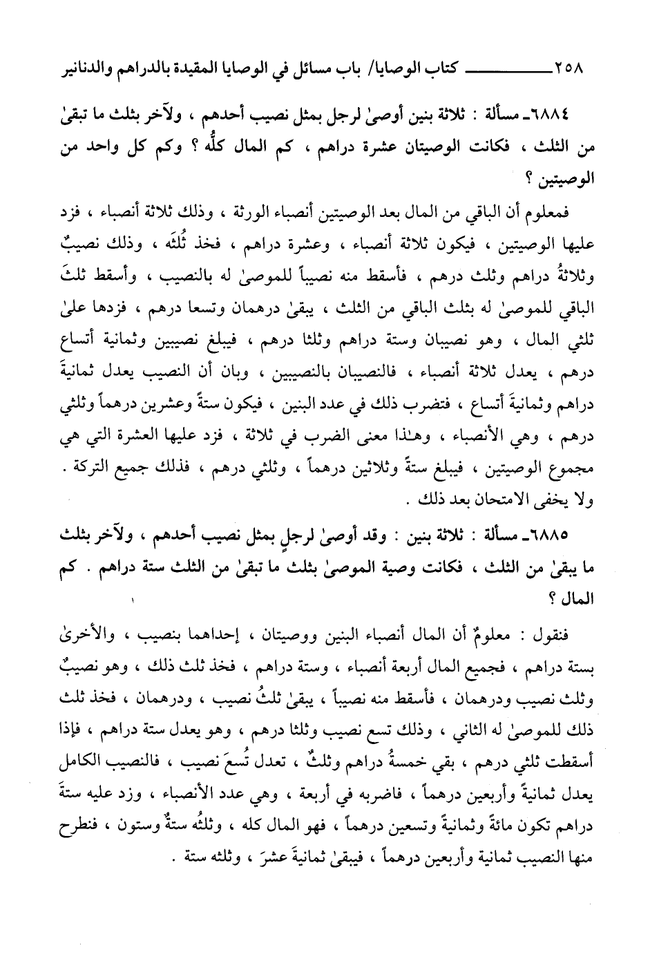 6884 - مسألة: ثلاثة بنين أوصى لرجل بمثل نصيب أحدهم، ولآخر بثلث ما تبقى من الثلث، فكانت الوصيتان عشرة دراهم، كم المال كلُّه؟ وكم كل واحد من الوصيتين؟