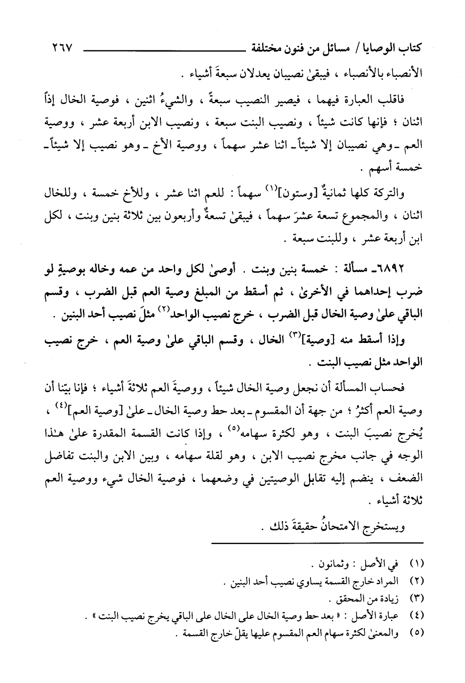 6892 - مسألة: خمسة بنين وبنت. أوصى لكل واحد من عمه وخاله بوصيةٍ لو ضرب إحداهما في الأخرى، ثم أسقط من المبلغ وصية العم قبل الضرب، وقسم الباقي على وصية الخال قبل الضرب، خرج نصيب الواحد (2) مثلَ نصيب أحد البنين.