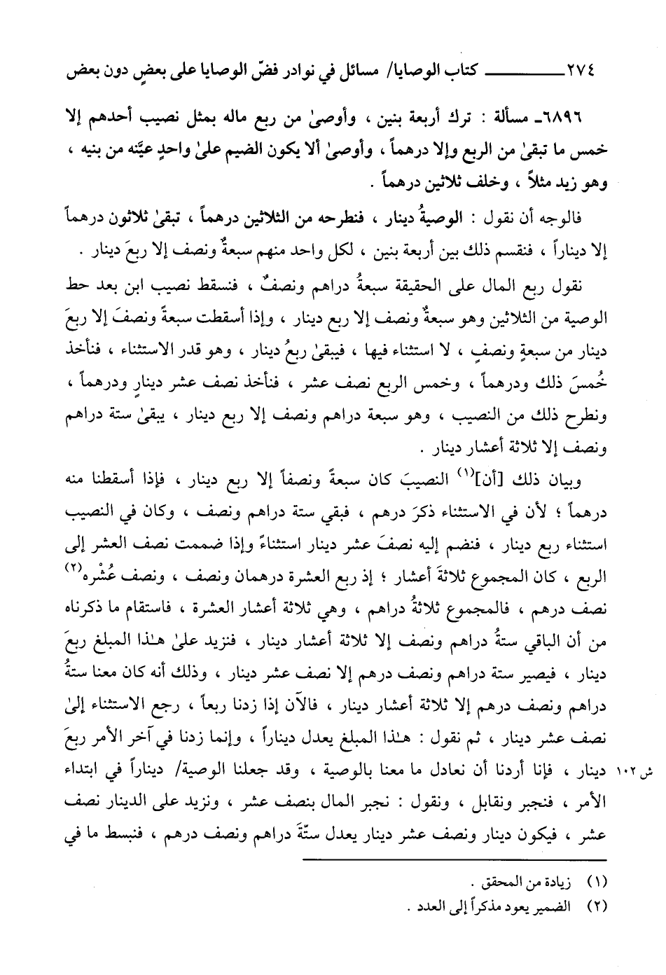 نقول ربع المال على الحقيقة سبعةُ دراهم ونصفٌ، فنسقط نصيب ابن بعد حط الوصية من الثلاثين وهو سبعةٌ ونصف إلا ربع دينار، وإذا أسقطت سبعةً ونصفَ إلا ربعَ دينار من سبعةٍ ونصفٍ، لا استثناء فيها، فيبقى ربعُ دينار، وهو قدر الاستثناء، فنأخذ خُمسَ ذلك ودرهماً، وخمس الربع نصف عشر، فنأخذ نصف عشر دينارٍ ودرهماً، ونطرح ذلك من النصيب، وهو سبعة دراهم ونصف إلا ربع دينار، يبقى ستة دراهم ونصف إلا ثلاثة أعشار دينار.