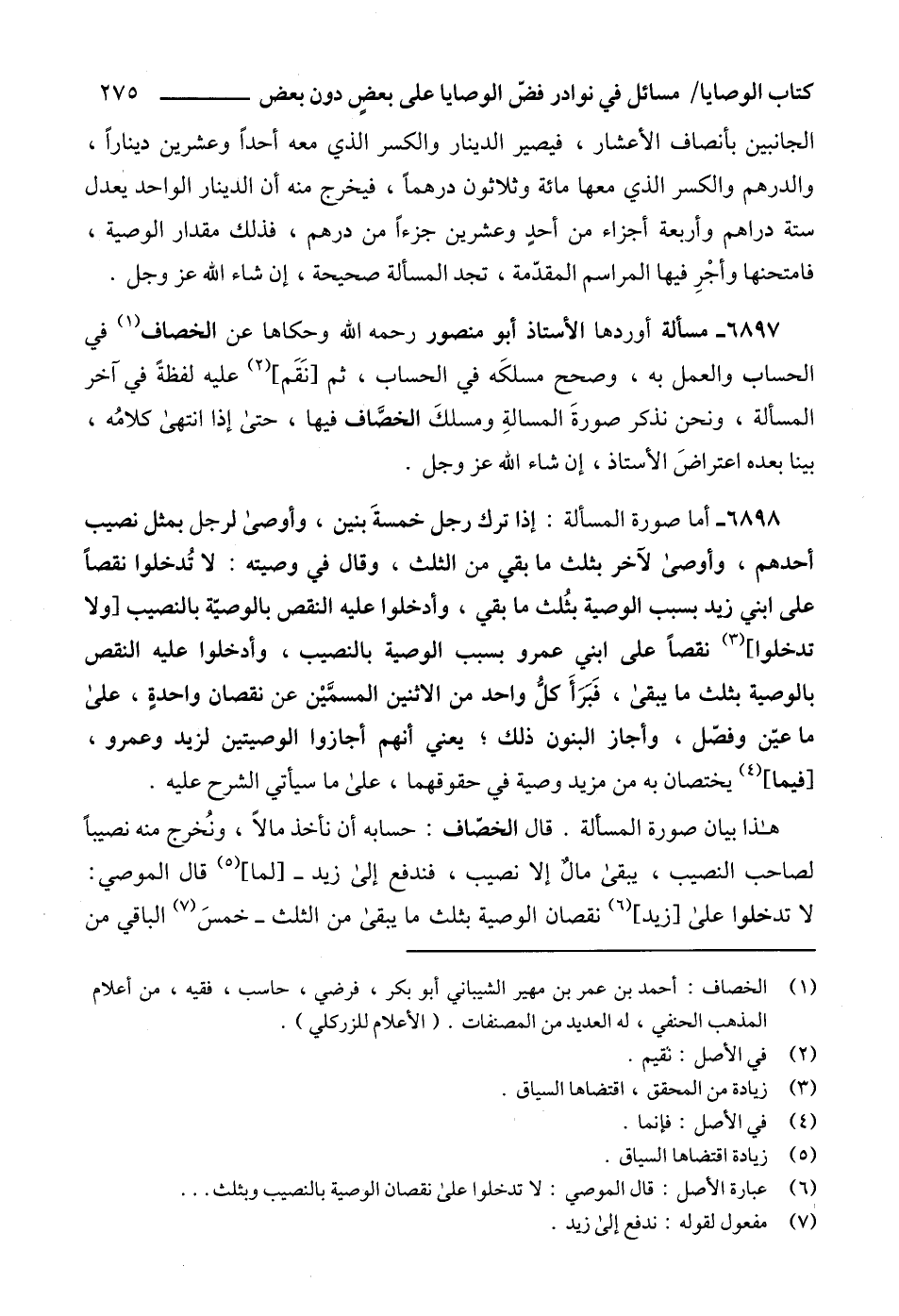 (1) الخصاف: أحمد بن عمر بن مهير الشيباني أبو بكر، فرضي، حاسب، فقيه، من أعلام المذهب الحنفي، له العديد من المصنفات. (الأعلام للزركلي).