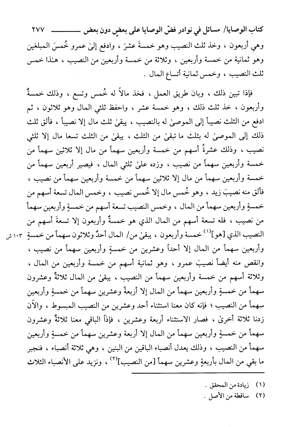 فإذا تبين ذلك، وبان طريق العمل، فخذ مالاً له خُمس وتسع، وذلك خمسةٌ وأربعون، خذ ثلث ذلك، وهو خمسة عشر، واحفظ ثلثي المال وهو ثلاثون، ثم ادفع من الثلث نصيباً إلى الموصى له بالنصيب، يبقى ثلث مال إلا نصيباً، فألق ثلث ذلك إلى الموصى له بثلث ما تبقى من الثلث، يبقى من الثلث تسعا مال إلا ثلثي نصيب، وذلك عشرةُ أسهم من خمسة وأربعين سهماً من مال إلا ثلاثين سهماً من خمسة وأربعين سهماً من نصيب، وزده على ثلثي المال، فيصير أربعين سهماً من خمسة وأربعين سهماً من مال إلا ثلاثين سهماً من خمسة وأربعين سهماً من نصيب، فألق منه نصيبَ زيد، وهو خُمس مال إلا خُمس نصيب، وخمس المال تسعة أسهم من خمسةٍ وأربعين سهماً من المال، وخمس النصيب تسعة أسهم من خمسةٍ وأربعين سهماً من نصيب، فله تسعة أسهم من المال الذي هو خمسةٌ وأربعون إلا تسعةَ أسهم من النصيب الذي [هو] (1) خمسة وأربعون، يبقى من المال أحدٌ وثلاثون سهماً من خمسةٍ وأربعين سهماً من المال إلا أحداً وعشرين من خمسةٍ وأربعين سهماً من نصيب، وانقص منه أيضاً نصيبَ عمرو، وهو ثمانية أسهم من خمسة وأربعين من المال، وثلاثة أسهم من خمسة وأربعين سهماً من النصيب، يبقى من المال ثلاثة وعشرون سهماً من خمسةٍ وأربعين سهماً من المال إلا أربعة وعشرين سهماً من خمسةٍ وأربعين سهماً من النصيب؛ فإنه كان معنا استثناء أحد وعشرين من النصيب المبسوط، والآن زدنا ثلاثة أخرى، فصار الاستثناء أربعة وعشرين، فإذاً الباقي معنا ثلاثة وعشرون سهماً من خمسةٍ وأربعين سهماً من المال إلا أربعة وعشرين سهماً من خمسةٍ وأربعين سهماً من النصيب، وذلك يعدل أنصباء الباقين من البنين، وهي ثلاثة أنصباء، فنجبر ما بقي من المال بأربعةٍ وعشرين سهماً [من النصيب] (2)، ونزيد على الأنصباء الثلاث