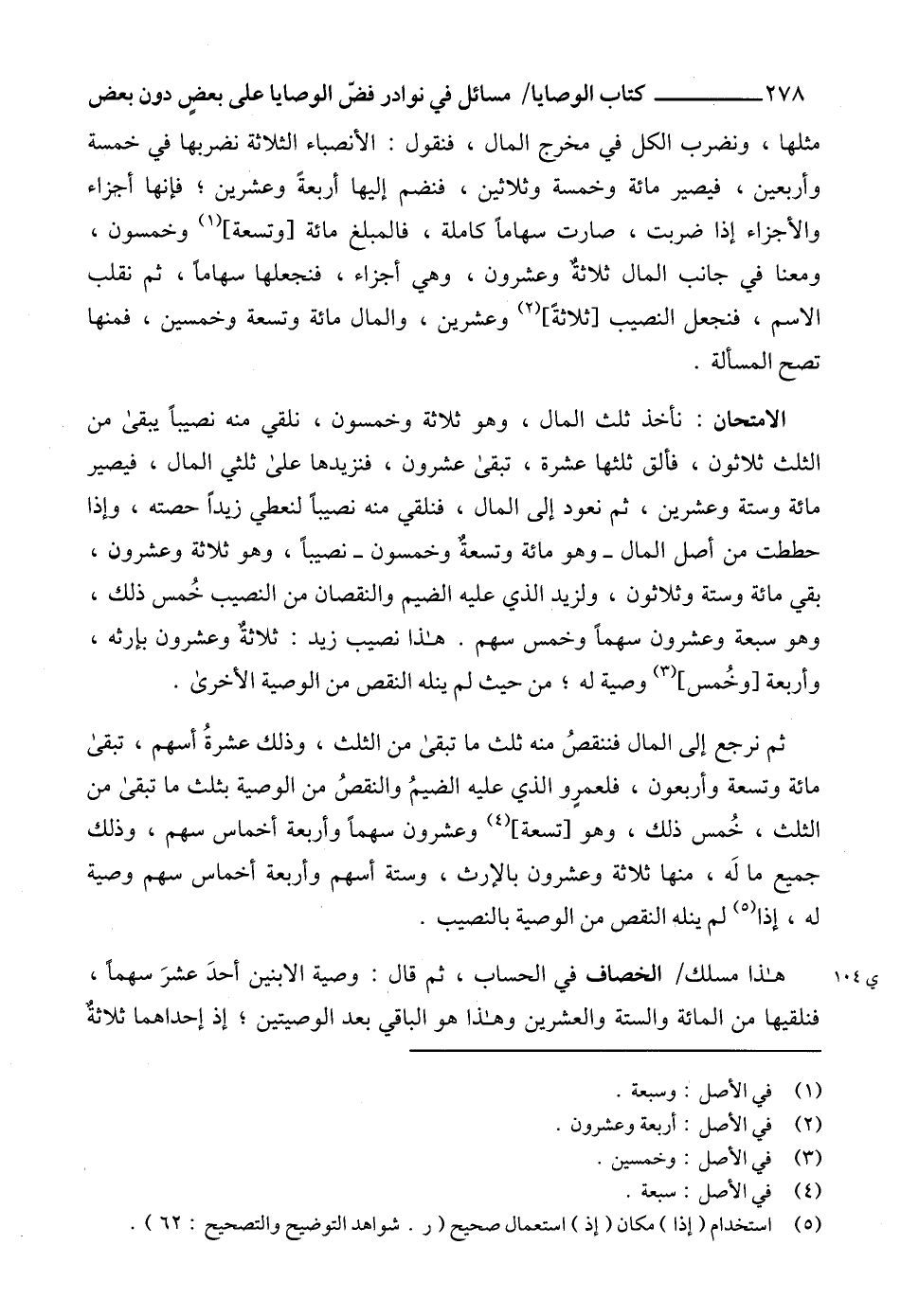 الامتحان: نأخذ ثلث المال، وهو ثلاثة وخمسون، نلقي منه نصيباً يبقى من الثلث ثلاثون، فألق ثلثها عشرة، تبقى عشرون، فنزيدها على ثلثي المال، فيصير مائة وستة وعشرين، ثم نعود إلى المال، فنلقي منه نصيباً لنعطي زيداً حصته، وإذا حططت من أصل المال -وهو مائة وتسعةٌ وخمسون- نصيباً، وهو ثلاثة وعشرون، بقي مائة وستة وثلاثون، ولزيد الذي عليه الضيم والنقصان من النصيب خُمس ذلك، وهو سبعة وعشرون سهماً وخمس سهم. هذا نصيب زيد: ثلاثة وعشرون بإرثه، وأربعة [وخُمس] (3) وصية له؛ من حيث لم ينله النقص من الوصية الأخرى.