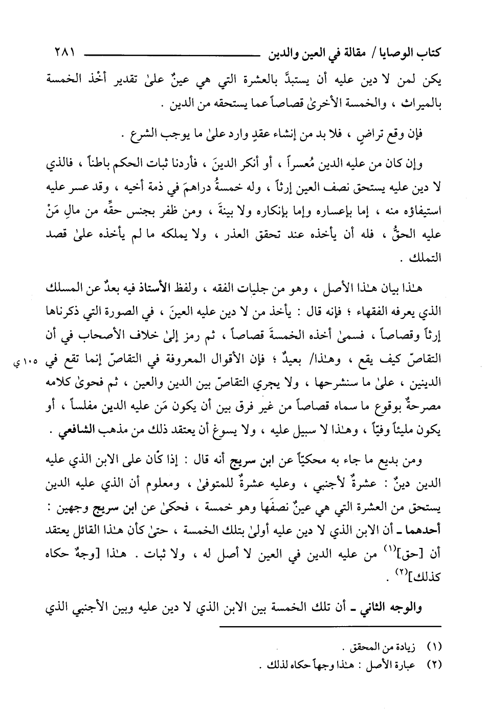 ومن بديع ما جاء به محكيّاً عن ابن سريج أنه قال: إذا كان على الابن الذي عليه الدين دينٌ: عشرةٌ لأجنبي، وعليه عشرةٌ للمتوفى، ومعلوم أن الذي عليه الدين يستحق من العشرة التي هي عينٌ نصفَها وهو خمسة، فحكى عن ابن سريج وجهين: أحدهما - أن الابن الذي لا دين عليه أولى بتلك الخمسة، حتى كأن هذا القائل يعتقد أن [حق] (1) من عليه الدين في العين لا أصل له، ولا ثبات. هذا [وجه حكاه كذلك] (2).