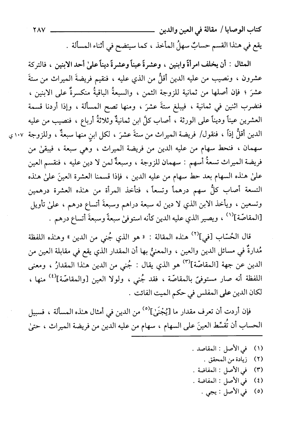 المثال: أن يخلف امرأةً وابنين، وعشرةً عيناً وعشرةً ديناً على أحد الابنين، فالتركة عشرون، ونصيب من عليه الدين أقلُّ من الذي عليه، فنقيم فريضةَ الميراث من ستةَ عشرَ؛ فإن أصلها من ثمانية للزوجة الثمن، والسبعةُ الباقيةُ منكسرةٌ على الابنين، فنضرب اثنين في ثمانية، فيبلغ ستةَ عشرَ، ومنها تصح المسألة، وإذا أردنا قسمة العشرين عيناً وديناً على الورثة، أصاب كلَّ ابن ثمانيةٌ وثلاثةُ أرباع، فنصيب من عليه الدين أقلُّ إذاً، فنقول فريضة الميراث من ستةَ عشرَ، لكل ابنٍ منها سبعةٌ، وللزوجة سهمان، فنحط سهام من عليه الدين من فريضة الميراث، وهي سبعة، فيبقى من فريضة الميراث تسعةُ أسهم: سهمان للزوجة، وسبعةٌ لمن لا دين عليه، فنقسم العين على هذه السهام بعد حط سهام من عليه الدين، فإذا قسمنا العشرة العينَ على هذه التسعة أصاب كلُّ سهم درهماً وتسعاً، فتأخذ المرأة من هذه العشرة درهمين وتسعين، ويأخذ الابن الذي لا دين له سبعة دراهم وسبعةَ أتساع درهم، على تأويل [المقاصّة] (1)، ويصير الذي عليه الدين كأنه استوفى سبعةً وسبعةَ أتساع درهم.