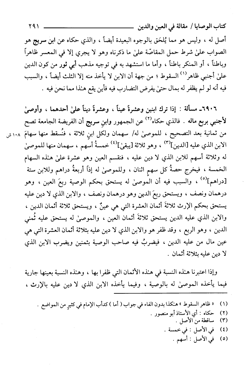 وإذا اعتبرنا هذه النسبة في هذه الأثمان التي ظفرا بها، وهذه النسبة بعينها جارية فيما يأخذه الموصى له بالوصية، وفيما يأخذه الابن الذي لا دين عليه بالإرث،