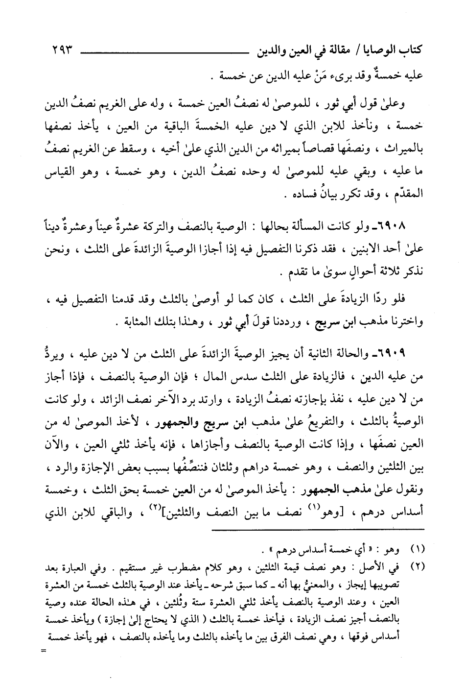 (2) في الأصل: وهو نصف قيمة الثلثين، وهو كلام مضطرب غير مستقيم. وفي العبارة بعد تصويبها إيجاز، والمعنيُّ بها أنه -كما سبق شرحه- يأخذ عند الوصية بالثلث خمسة من العشرة العين، وعند الوصية بالنصف يأخذ ثلثي العشرة ستة وثُلثين، في هذه الحالة عنده وصية بالنصف أجيز نصف الزيادة، فيأخذ خمسة بالثلث (الذي لا يحتاج إلى إجازة) ويأخذ خمسة أسداس فوقها، وهي نصف الفرق بين ما يأخذه بالثلث وما يأخذه بالنصف، فهو يأخذ خمسة =