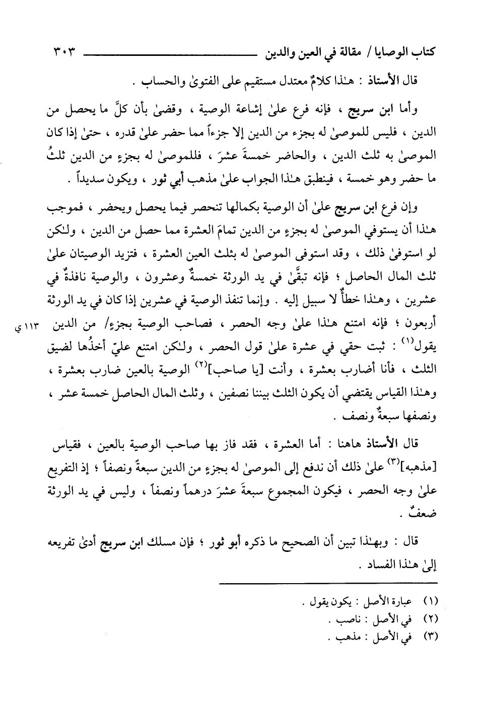 وأما ابن سريج، فإنه فرع على إشاعة الوصية، وقضى بأن كلَّ ما يحصل من الدين، فليس للموصى له بجزء من الدين إلا جزءاً مما حضر على قدره، حتى إذا كان الموصى به ثلث الدين، والحاضر خمسةَ عشرَ، فللموصى له بجزءٍ من الدين ثلثُ ما حضر وهو خمسة، فينطبق هذا الجواب على مذهب أبي ثور، ويكون سديداً.