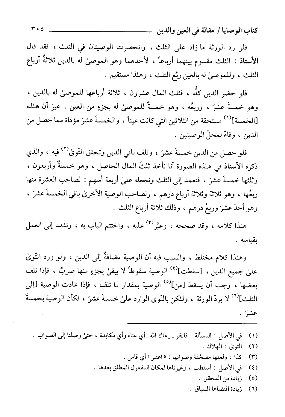 فلو حصل من الدين خمسةَ عشرَ، وتلف باقي الدين وتحقق التّوى (2) فيه، والذي ذكره الأستاذ في هذه الصورة أنا نأخذ ثلثَ المال الحاصل، وهو خمسة وأربعون، وثلثها خمسةَ عشرَ، فنعمد إلى الثلث ونجعله على أربعة أسهم: لصاحب العشرة منها ربعُها، وهو ثلاثة وثلاثة أرباع درهم، ولصاحب الوصية الأخرى باقي الخمسةَ عشرَ، وهو أحدَ عشرَ وربعُ درهم، وذلك ثلاثة أرباع الثلث.