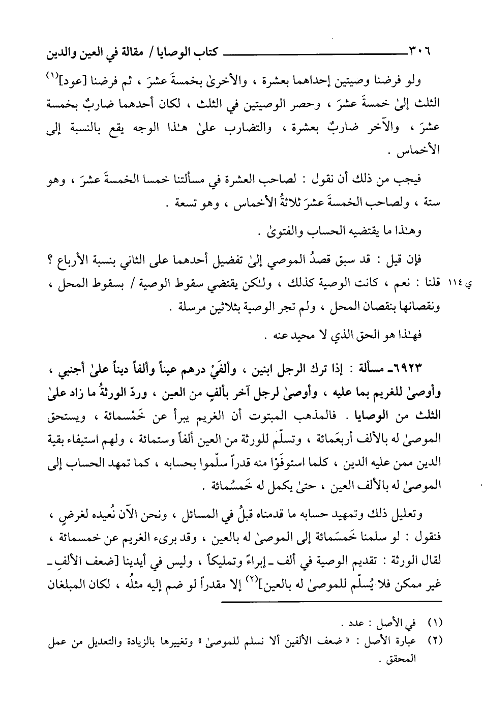 (2) عبارة الأصل: "ضعف الألفين ألا نسلم للموصى" وتغييرها بالزيادة والتعديل من عمل المحقق.