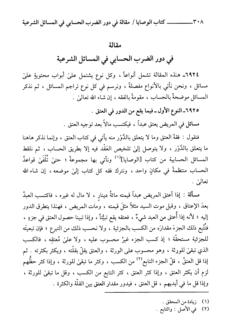 فنقول: فقهُ العتق وما لا يتعلق بالدَّوْر منه يأتي في كتاب العتق، وإنما نذكر هاهنا ما يتعلق بالدَّوْر، ولا يتوصل إلى تلخيص العَقْد فيه إلا بطريق الحساب، ثم نلقط المسائل الحسابية من كتاب [الوصايا] (1) ونأتي بها مجموعةً؛ حتى تُلْفَى قواعدُ الحساب منتظمةً في مكانٍ واحد، ونترك فقه كل كتاب إلى موضعه، إن شاء الله تعالى.