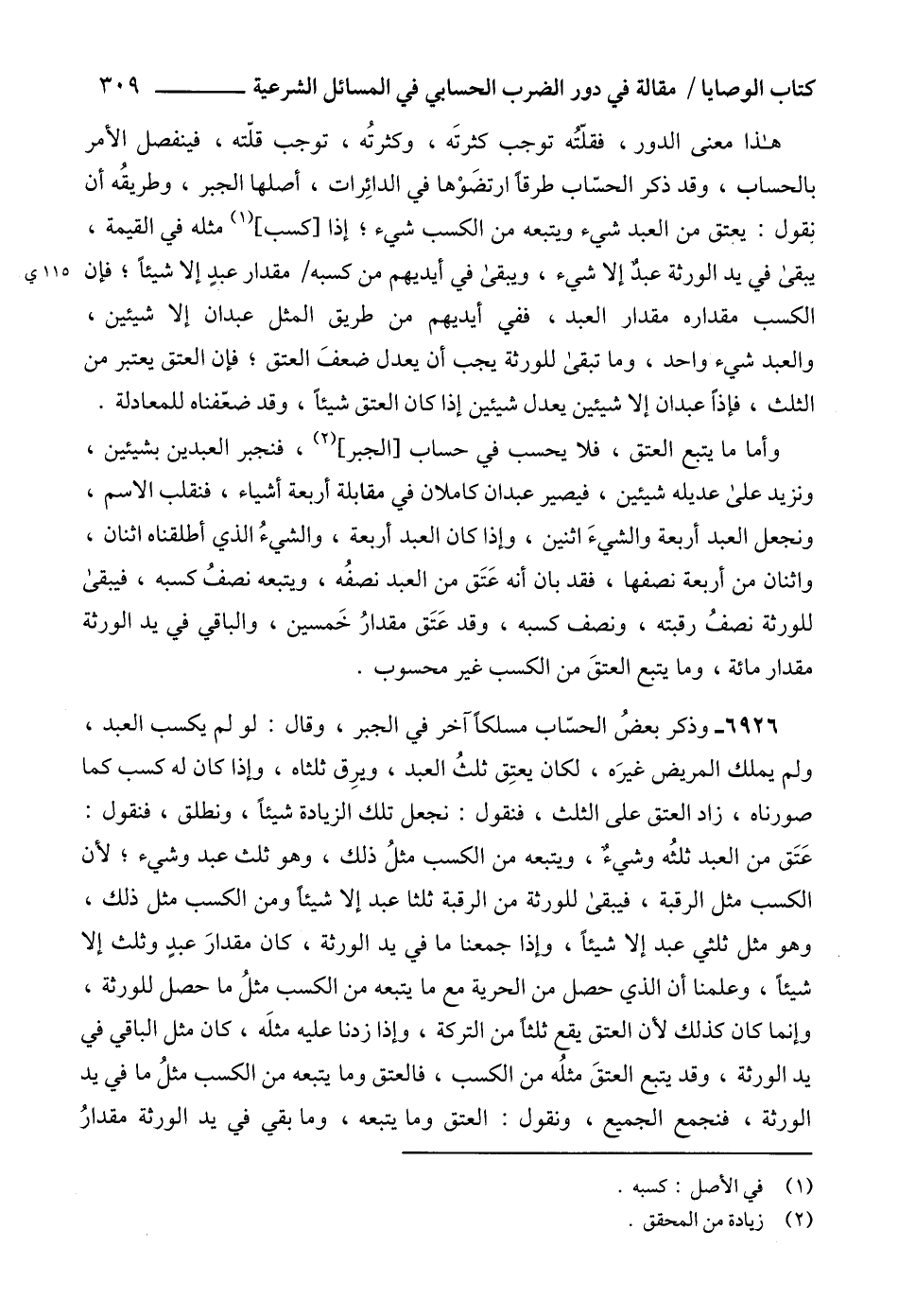 هذا معنى الدور، فقلّتُه توجب كثرتَه، وكثرتُه، توجب قلّته، فينفصل الأمر بالحساب، وقد ذكر الحسّاب طرقاً ارتضَوْها في الدائِرات، أصلها الجبر، وطريقُه أن نقول: يعتق من العبد شيء ويتبعه من الكسب شيء؛ إذا [كسب] (1) مثله في القيمة، يبقى في يد الورثة عبدٌ إلا شيء، ويبقى في أيديهم من كسبه مقدار عبدٍ إلا شيئاً؛ فإن الكسب مقداره مقدار العبد، ففي أيديهم من طريق المثل عبدان إلا شيئين، والعبد شيء واحد، وما تبقى للورثة يجب أن يعدل ضعفَ العتق، فإن العتق يعتبر من الثلث، فإذاً عبدان إلا شيئين يعدل شيئين إذا كان العتق شيئاً، وقد ضعّفناه للمعادلة.