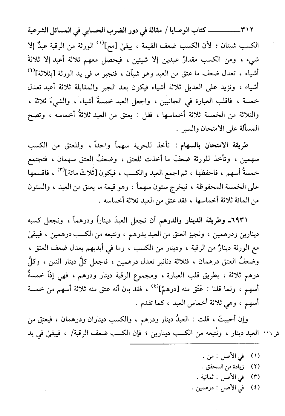 ْطريقة الامتحان بالسهام: نأخذ للحرية سهماً واحداً، وللعتق من الكسب سهمين، وتأخذ للورثة ضعفَ ما أخذت للعتق، وضعفُ العتق سهمان، فتجتمع خمسةُ أسهم، فاحفظها، ثم اجمع العبد والكسب، فيكون [ثَلاثَ مائة] (3)، فاقسمها على الخمسة المحفوظة، فيخرج ستون سهماً، وهو قيمة ما يعتق من العبد، والستون من المائة ثلاثة أخماسها، فقد عتق من العبد ثلاثة أخماسه.