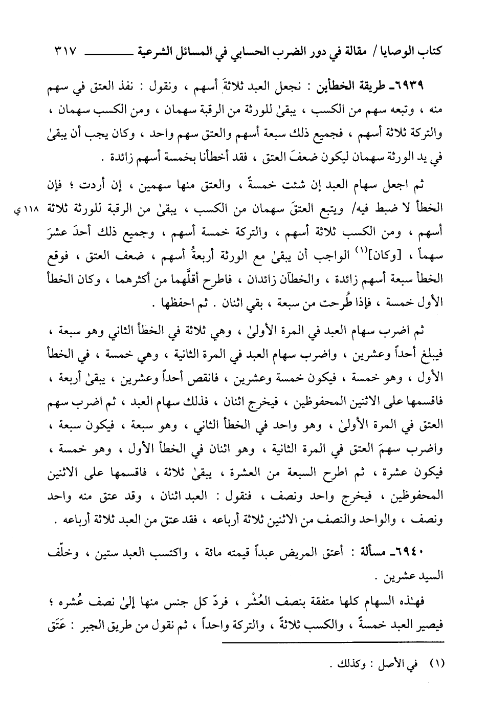 6939 - طريقة الخطأين: نجعل العبد ثلاثةَ أسهم، ونقول: نفذ العتق في سهم منه، وتبعه سهم من الكسب، يبقى للورثة من الرقبة سهمان، ومن الكسب سهمان، والتركة ثلاثة أسهم، فجميع ذلك سبعة أسهم والعتق سهم واحد، وكان يجب أن يبقى في يد الورثة سهمان ليكون ضعفَ العتق، فقد أخطأنا بخمسة أسهم زائدة.