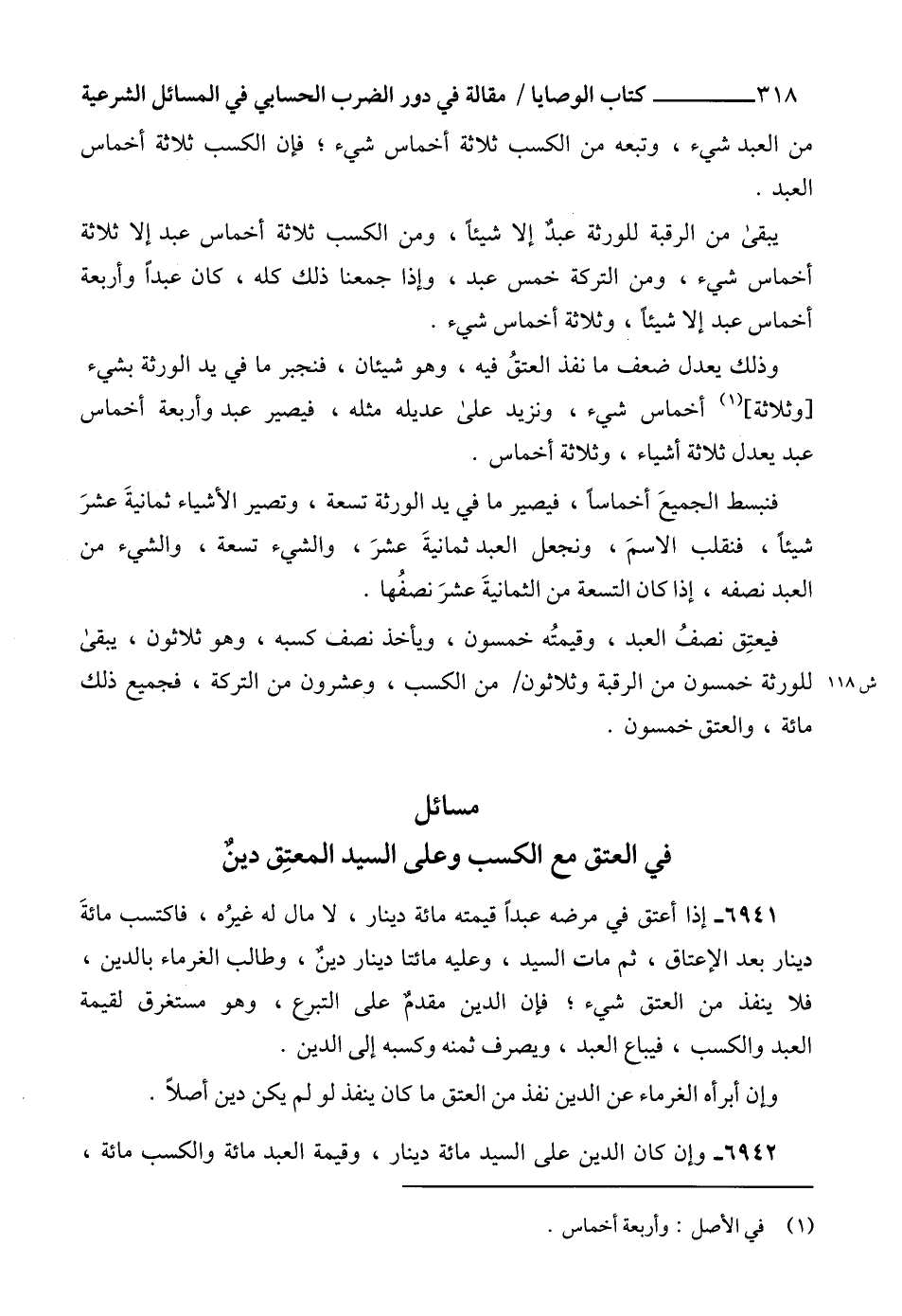 فنبسط الجميعَ أخماساً، فيصير ما في يد الورثة تسعة، وتصير الأشياء ثمانيةَ عشرَ شيئاً، فنقلب الاسمَ، ونجعل العبد ثمانيةَ عشرَ، والشيء تسعة، والشيء من العبد نصفه، إذا كان التسعة من الثمانيةَ عشرَ نصفُها.