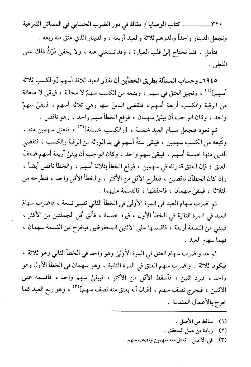 ثم اضرب سهام العبد في المرة الأولى في الخطأ الثاني تصير تسعة، فاضرب سهامَ العبد في المرة الثانية في الخطأ الأول، فيرد خمسة، فألق أقل الجملتين من الأكثر، فيبقي من التسعة أربعة، فاقسمها على الاثنين المحفوظين فيخرج من القسمة سهمان، فهما سهام العبد.