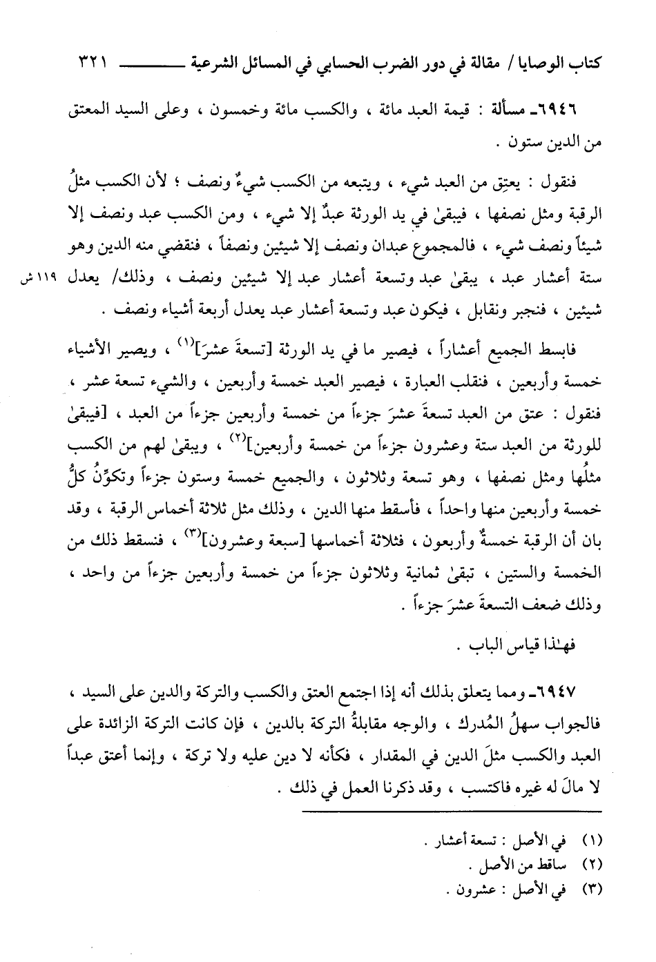 فنقول: يعتِق من العبد شيء، ويتبعه من الكسب شيءٌ ونصف؛ لأن الكسب مثلُ الرقبة ومثل نصفها، فيبقى في يد الورثة عبدٌ إلا شيء، ومن الكسب عبد ونصف إلا شيئاً ونصف شيء، فالمجموع عبدان ونصف إلا شيئين ونصفاً، فنقضي منه الدين وهو ستة أعشار عبد، يبقى عبد وتسعة أعشار عبد إلا شيئين ونصف، وذلك يعدل شيئين، فنجبر ونقابل، فيكون عبد وتسعة أعشار عبد يعدل أربعة أشياء ونصف.