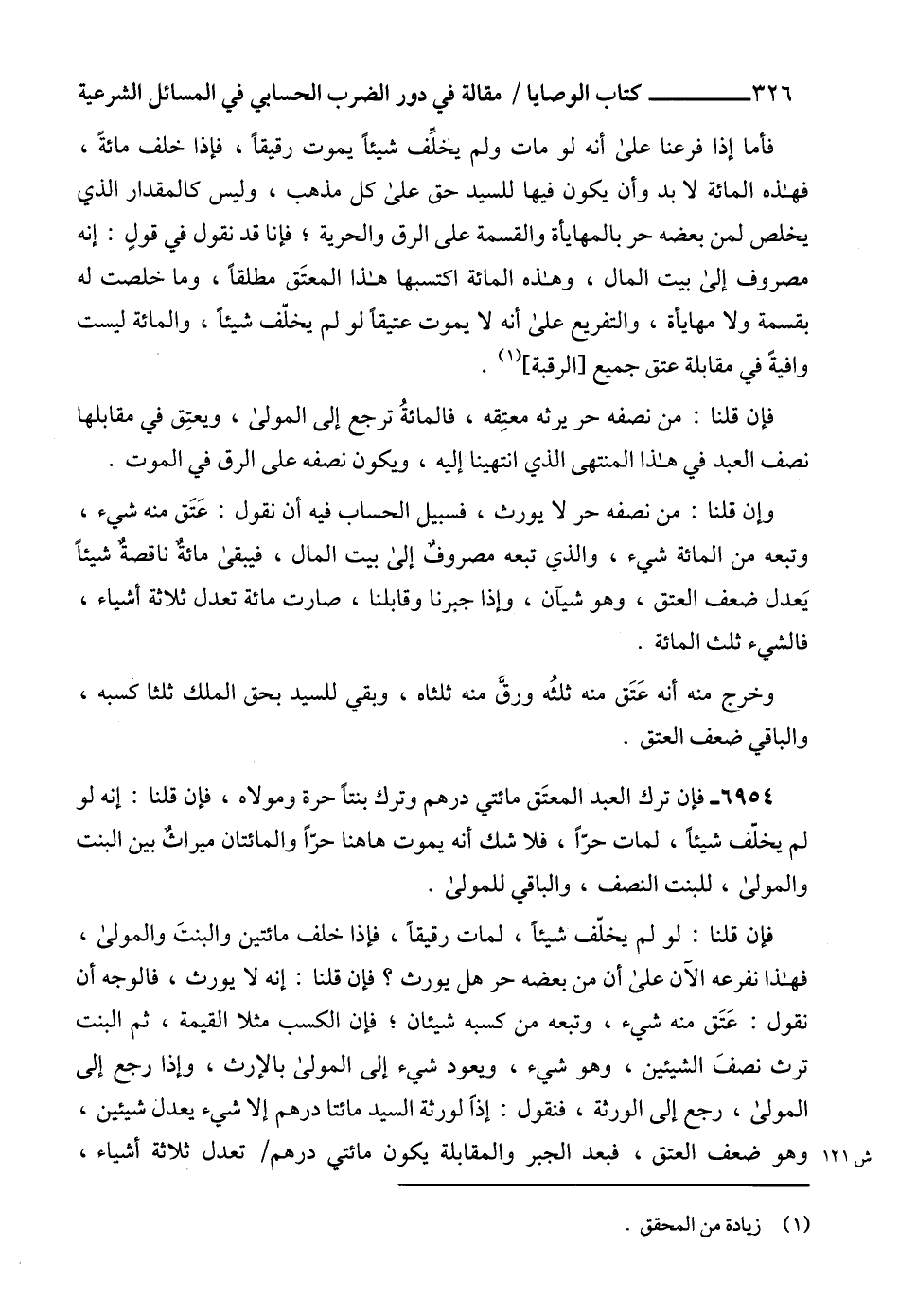 وإن قلنا: من نصفه حر لا يورث، فسبيل الحساب فيه أن نقول: عَتَق منه شيء، وتبعه من المائة شيء، والذي تبعه مصروفٌ إلى بيت المال، فيبقى مائةٌ ناقصةٌ شيئاً يَعدل ضعف العتق، وهو شيآن، وإذا جبرنا وقابلنا، صارت مائة تعدل ثلاثة أشياء، فالشيء ثلث المائة.