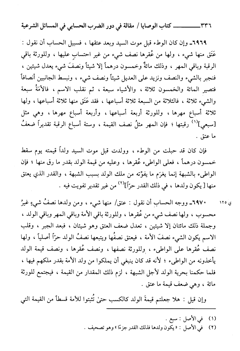 6970 - ووجه الحساب أن نقول: عتق منها شيء، ومن ولدها نصفُ شيء غيرُ محسوب، ولها نصف شيء من عُقرها، وللورثة باقي الأمة وباقي المهر وباقي الولد، وجملة ذلك مائتان إلا شيئين، تعدل ضعف العتق وهو شيئان، فبعد الجبر، وقلب الاسم يكون الشيء نصفَ الأمة، فيعتق نصفُها ويتبعها نصفُ الولد حرّاً أصلياً، ولها نصف عُقرها على الواطىء، وللورثة نصفها، ونصف عُقرها، ونصف قيمة الولد يأخذونه من الواطىء؛ لأنه قد كان ينبغي أن يملكوا من ولد الأمة بقدر ملكهم فيها، فلما حكمنا بحرية الولد لأجل الشبهة، لزم ذلك المقدار من القيمة، فيجتمع للورثة مائة، وهي ضعف قيمة ما عتق.