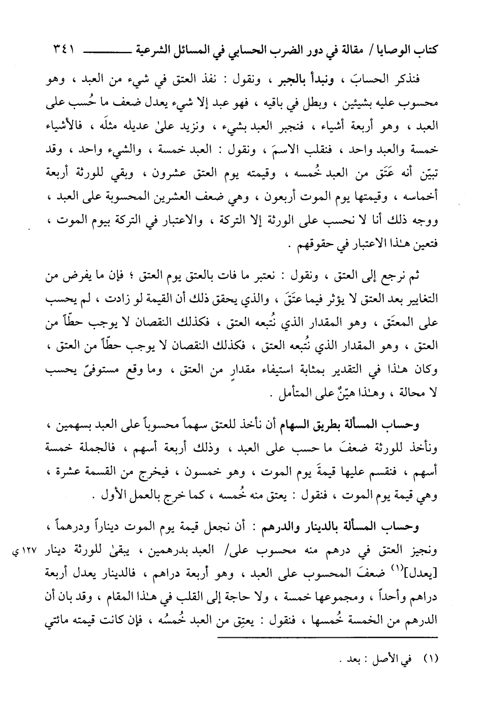 فنذكر الحسابَ، ونبدأ بالجبر، ونقول: نفذ العتق في شيء من العبد، وهو محسوب عليه بشيئين، وبطل في باقيه، فهو عبد إلا شيء يعدل ضعف ما حُسب على العبد، وهو أربعة أشياء، فنجبر العبد بشيء، ونزيد على عديله مثلَه، فالأشياء خمسة والعبد واحد، فنقلب الاسمَ، ونقول: العبد خمسة، والشيء واحد، وقد تبيّن أنه عَتَق من العبد خُمسه، وقيمته يوم العتق عشرون، وبقي للورثة أربعة أخماسه، وقيمتها يوم الموت أربعون، وهي ضعف العشرين المحسوبة على العبد، ووجه ذلك أنا لا نحسب على الورثة إلا التركة، والاعتبار في التركة بيوم الموت، فتعين هذا الاعتبار في حقوقهم.