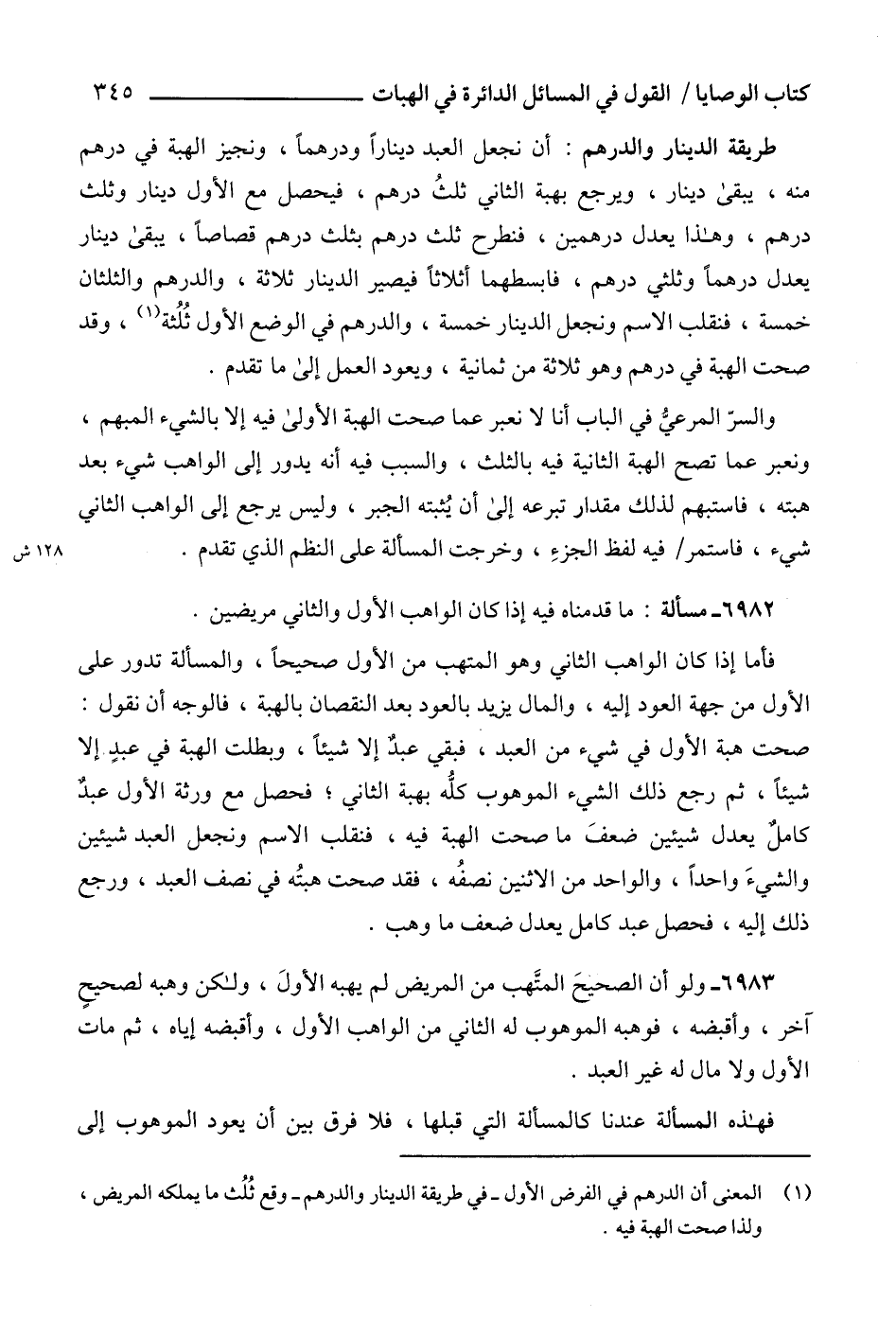 (1) المعنى أن الدرهم في الفرض الأول -في طريقة الدينار والدرهم- وقع ثُلُث ما يملكه المريض، ولذا صحت الهبة فيه.