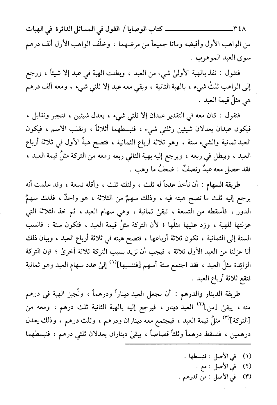 طريقة السهام: أن نأخذ عدداً له ثلث، ولثلثه ثلث، وأقله تسعة، وقد علمت أنه يرجع إليه ثلث ما تصح هبته فيه، وذلك سهمٌ من الثلاثة، هو واحدٌ، فذلك سهمُ الدور، فأسقطه من التسعة، تبقى ثمانية، وهي سهام العبد، ثم خذ الثلاثة التي عزلتها للهبة، وزد عليها مثلَها؛ لأن التركة مثلُ قيمة العبد، فتكون ستة، فانسب الستة إلى الثمانية، تكون ثلاثة أرباعها، فتصح هبته في ثلاثة أرباع العبد، وبيان ذلك أنا عزلنا من العبد الأول ثلاثة، فيجب أن نزيد بسبب التركة ثلاثة أخرى؛ فإن التركة الزائِدة مثلُ العبد، فقد اجتمع ستة أسهم [فننسبها] (1) إلى عدد سهام العبد وهو ثمانية فتقع ثلاثة أرباع العبد.
