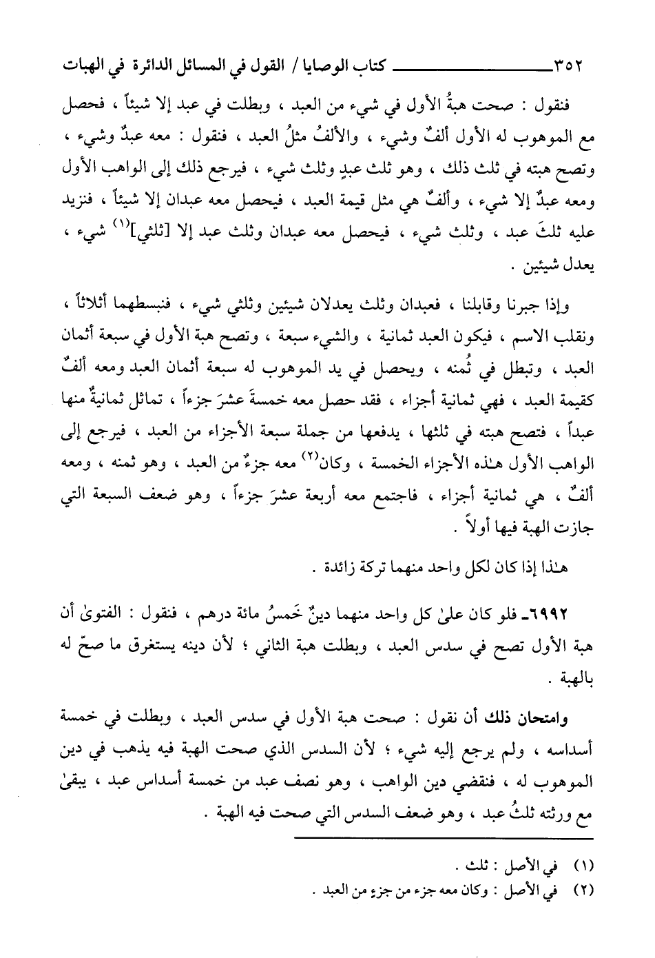 فنقول: صحت هبةُ الأول في شيء من العبد، وبطلت في عبد إلا شيئاً، فحصل مع الموهوب له الأول ألفٌ وشيء، والألفُ مثلُ العبد، فنقول: معه عبدٌ وشيء، وتصح هبته في ثلث ذلك، وهو ثلث عبدٍ وثلث شيء، فيرجع ذلك إلى الواهب الأول ومعه عبدٌ إلا شيء، وألفٌ هي مثل قيمة العبد، فيحصل معه عبدان إلا شيئاً، فنزيد عليه ثلثَ عبد، وثلث شيء، فيحصل معه عبدان وثلث عبد إلا [ثلثي] (1) شيء، يعدل شيئين.