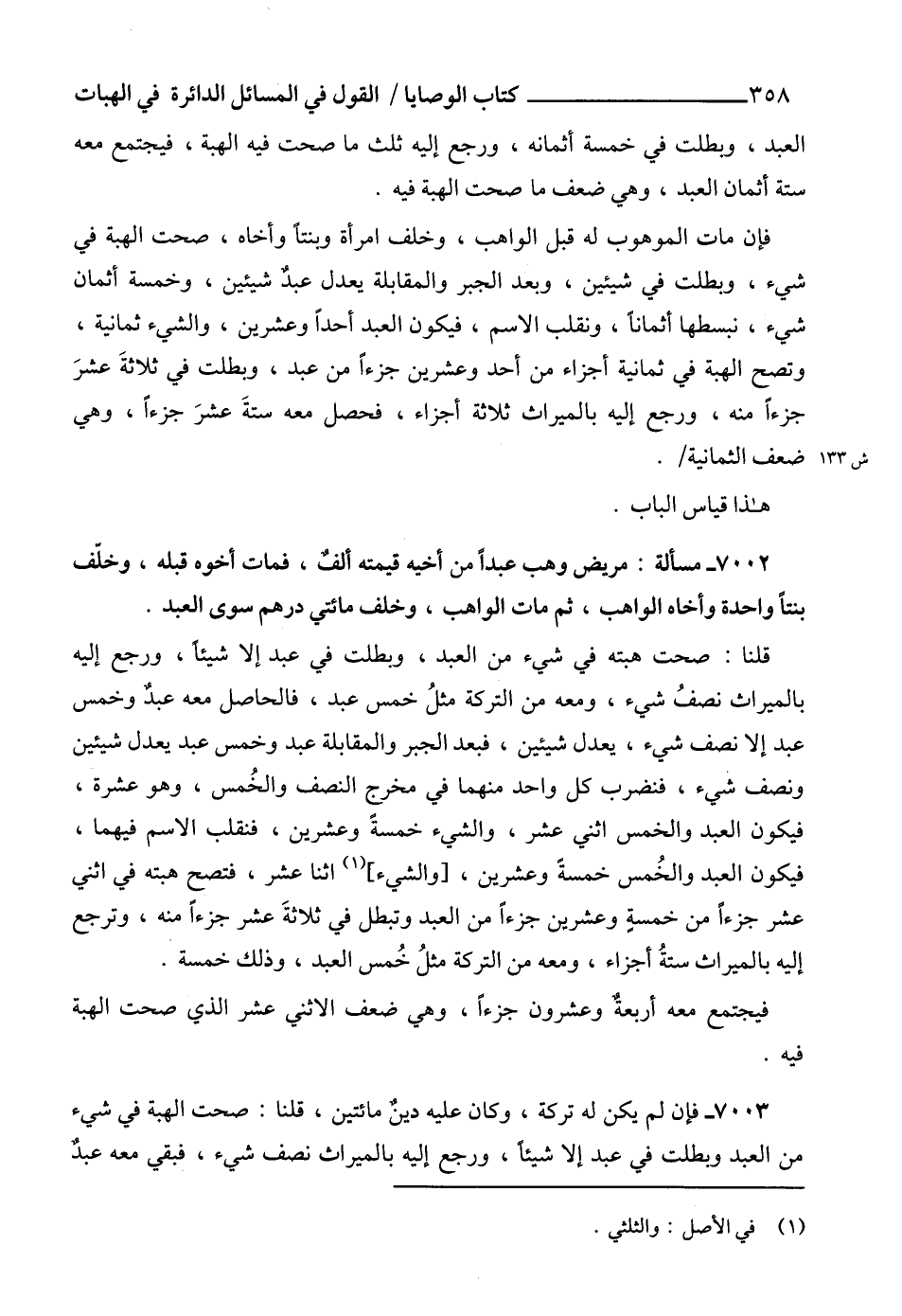 7003 - فإن لم يكن له تركة، وكان عليه دينٌ مائتين، قلنا: صحت الهبة في شيء من العبد وبطلت في عبد إلا شيئاً، ورجع إليه بالميراث نصف شيء، فبقي معه عبدٌ