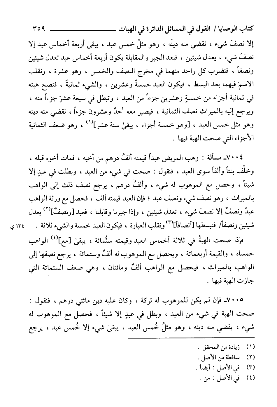 إلا نصفَ شيء، نقضي منه دينَه، وهو مثلُ خمس عبد، يبقى أربعة أخماس عبد إلا نصفَ شيء، يعدل شيئين، فبعد الجبر والمقابلة يكون أربعة أخماس عبد تعدل شيئين ونصفاً، فنضرب كل واحد منهما في مخرج النصف والخمس، وهو عشرة، ونقلب الاسمَ فيهما بعد البسط، فيكون العبد خمسةً وعشرين، والشيء ثمانيةً، فتصح هبته في ثمانية أجزاء من خمسةٍ وعشرين جزءاً من العبد، وتبطل في سبعة عشرَ جزءاً منه، ويرجع إليه بالميراث نصف الثمانية، فيصير معه أحدٌ وعشرون جزءاً، نقضي منه دينه وهو مثل خمس العبد، [وهو خمسة أجزاء، يبقى ستة عشر] (1)، وهو ضعف الثمانية الأجزاء التي صحت الهبة فيها.