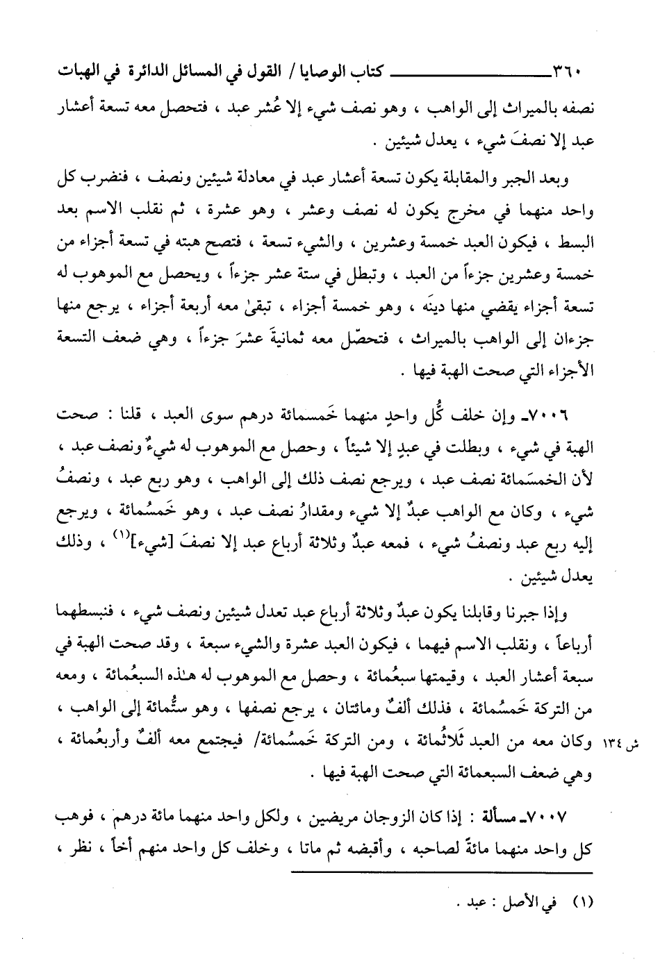 وإذا جبرنا وقابلنا يكون عبدٌ وثلاثة أرباع عبد تعدل شيئين ونصف شيء، فنبسطهما أرباعاً، ونقلب الاسم فيهما، فيكون العبد عشرة والشيء سبعة، وقد صحت الهبة في سبعة أعشار العبد، وقيمتها سبعُمائة، وحصل مع الموهوب له هذه السبعُمائة، ومعه من التركة خَمسُمائة، فذلك ألفٌ ومائتان، يرجع نصفها، وهو ستُّمائة إلى الواهب، وكان معه من العبد ثَلاثُمائة، ومن التركة خَمسُمائة فيجتمع معه ألفٌ وأربعُمائة، وهي ضعف السبعمائة التي صحت الهبة فيها.