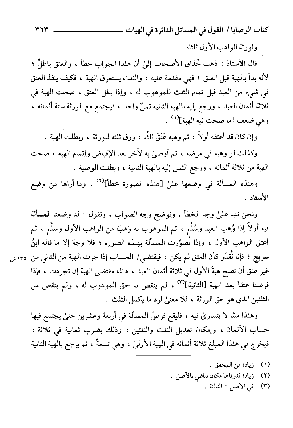 قال الأستاذ: ذهب حُذاق الأصحاب إلى أن هذا الجواب خطأ، والعتق باطلٌ؛ لأنه بدأ بالهبة قبل العتق؛ فهي مقدمة عليه، والثلث يستغرق الهبة، فكيف ينفذ العتق في شيء من العبد قبل تمام الثلث للموهوب له، وإذا بطل العتق، صحت الهبة في ثلاثة أثمان العبد، ورجع إليه بالهبة الثانية ثمنٌ واحد، فيجتمع مع الورثة ستة أثمانه، وهي ضعف [ما صحت فيه الهبة] (1).