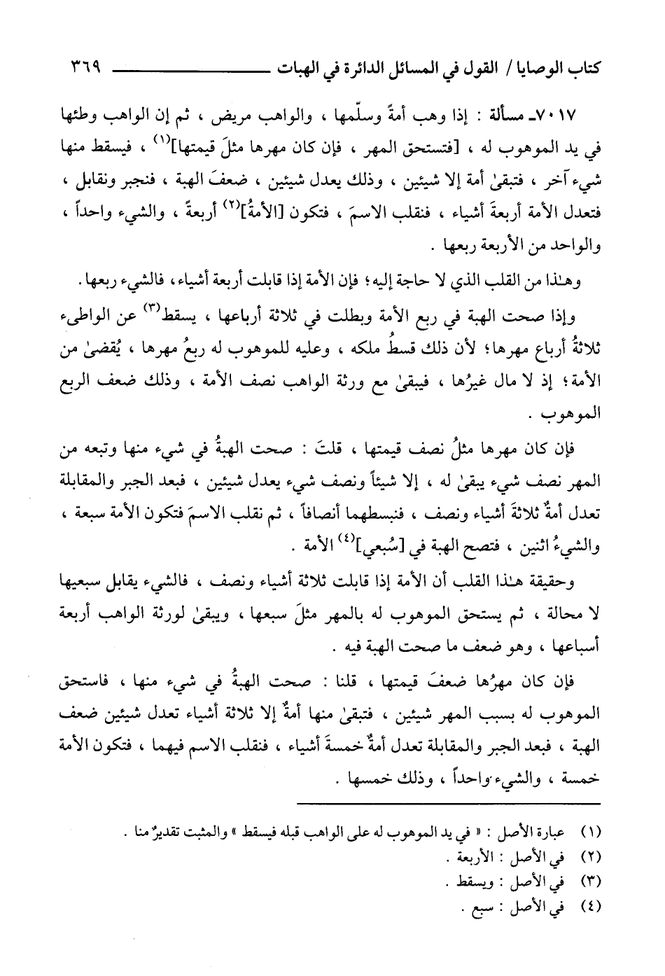 7017 - مسألة: إذا وهب أمةً وسلّمها، والواهب مريض، ثم إن الواهب وطئها في يد الموهوب له، [فتستحق المهر، فإن كان مهرها مثلَ قيمتها] (1)، فيسقط منها شيء آخر، فتبقى أمة إلا شيئين، وذلك يعدل شيئين، ضعفَ الهبة، فنجبر ونقابل، فتعدل الأمة أربعةَ أشياء، فنقلب الاسمَ، فتكون [الأمةُ] (2) أربعةً، والشيء واحداً، والواحد من الأربعة ربعها.