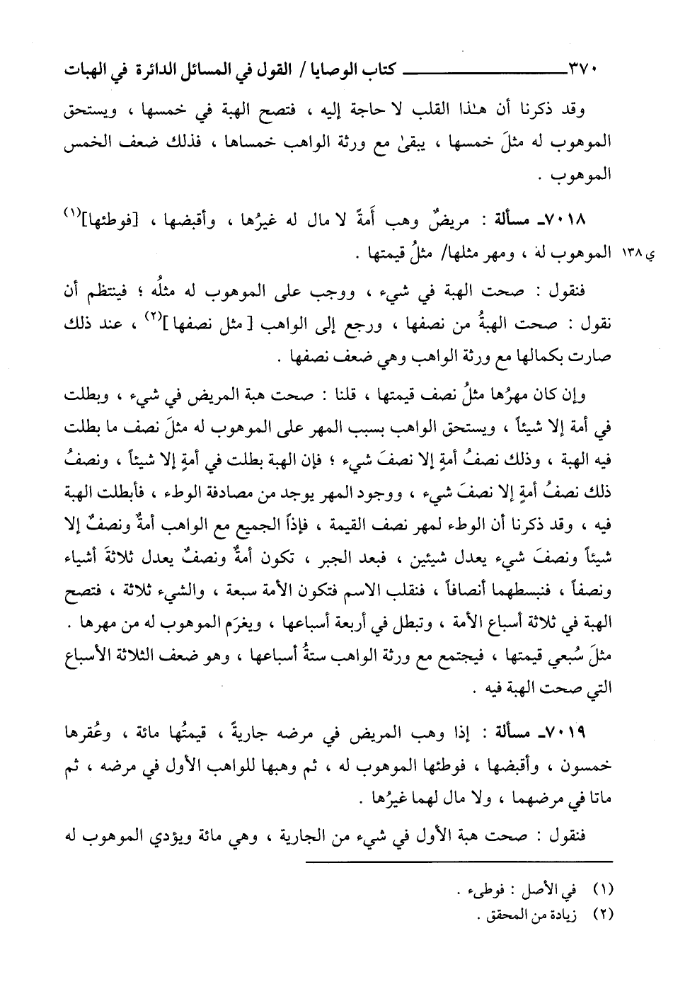 7018 - مسألة: مريضٌ وهب أَمةً لا مال له غيرُها، وأقبضها، [فوطئها] (1) الموهوب له، ومهر مثلها مثلُ قيمتها.