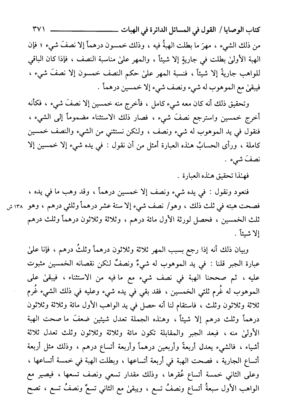 وتحقيق ذلك أنه كان معه شيء كامل، فأخرج منه خمسين إلا نصفَ شيء، فكأنه أخرج خمسين واسترجع نصفَ شيء، فصار ذلك الاستثناء مضموماً إلى الشيء، فنقول في يد الموهوب له شيء ونصف، ولكن نستثني من الشيء والنصف خمسين كاملة، ورأى الحسابُ هذه العبارة أمثل من أن نقول: في يده شيء إلا خمسين إلا نصفَ شيء.