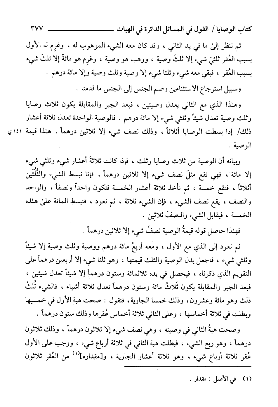 وهذا الذي مع الثاني يعدل وصيتين، فبعد الجبر والمقابلة يكون ثلاث وصايا وثلث وصية تعدل شيئاً وثلثي شيء إلا مائة درهم. فالوصية الواحدة تعدل ثلاثة أعشار ذلك إذا بسطت الوصايا أثلاثاً، وذلك نصف شيء إلا ثلاثين درهماً. هذا قيمة الوصية.