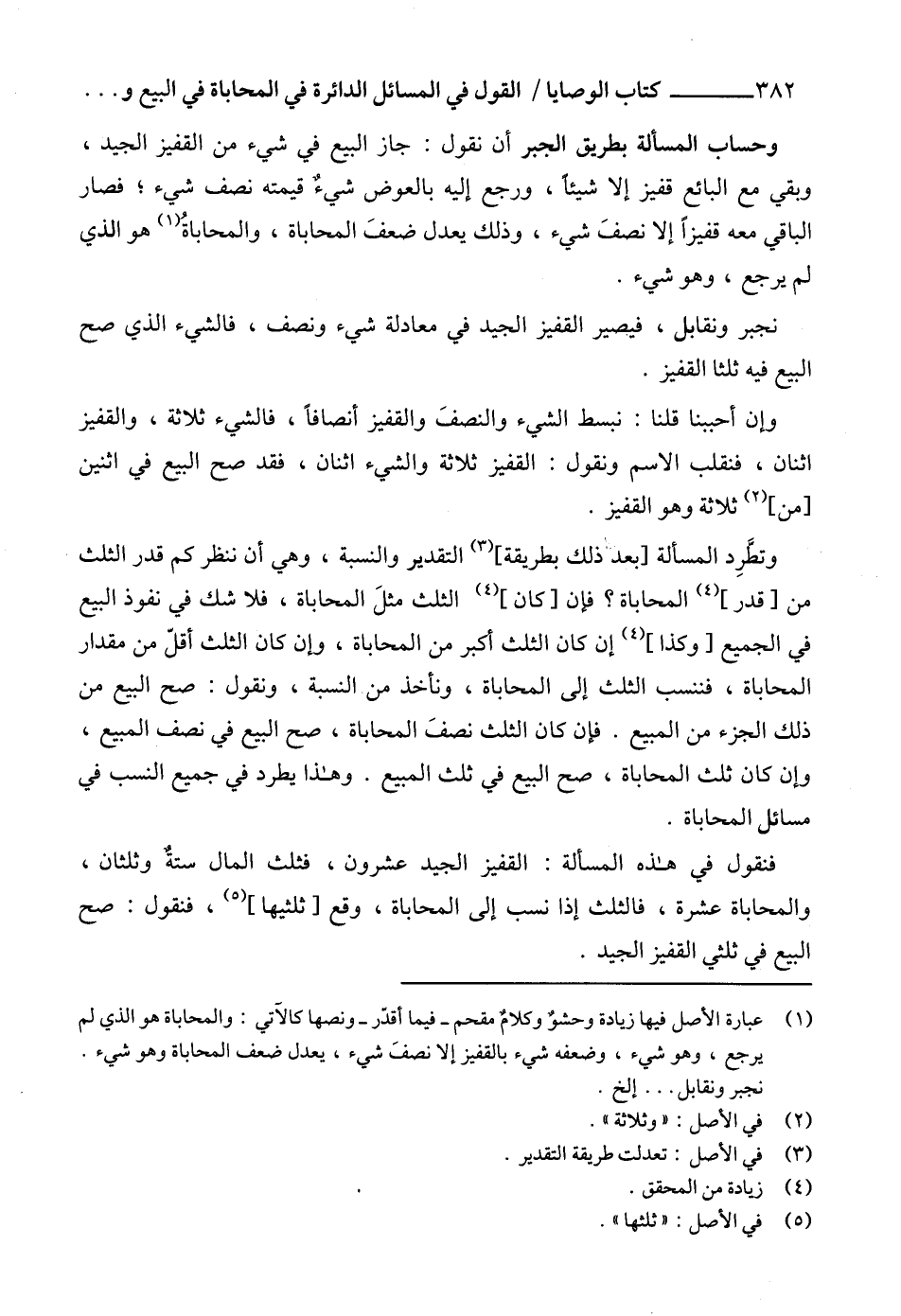 (1) عبارة الأصل فيها زيادة وحشوٌ وكلامٌ مقحم -فيما أقدّر- ونصها كالآتي: والمحاباة هو الذي لم يرجع، وهو شيء، وضعفه شيء بالقفيز إلا نصفَ شيء، يعدل ضعف المحاباة وهو شيء. نجبر ونقابل ... إلخ.
