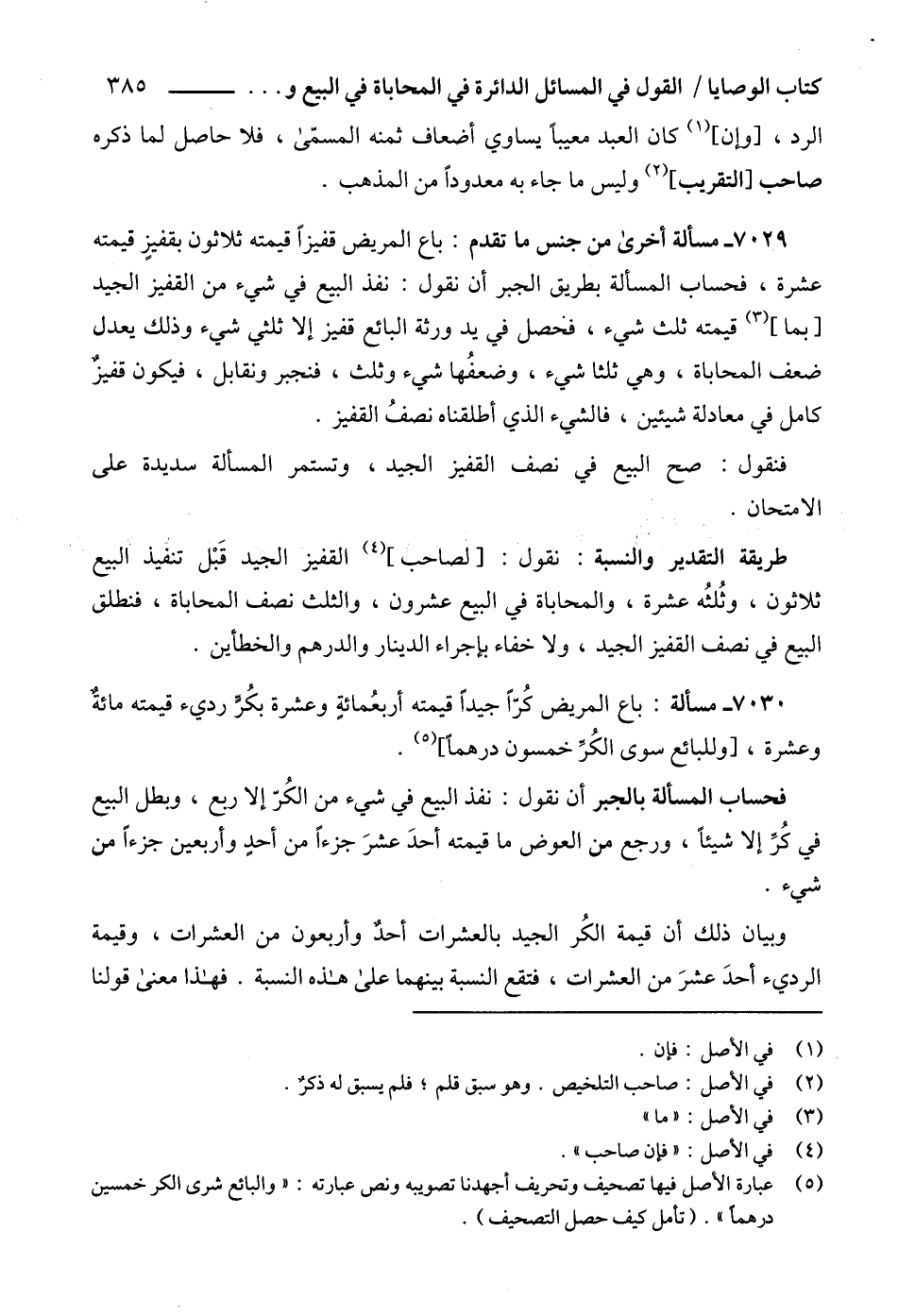 (5) عبارة الأصل فيها تصحيف وتحريف أجهدنا تصويبه ونص عبارته: "والبائع شرى الكر خمسين