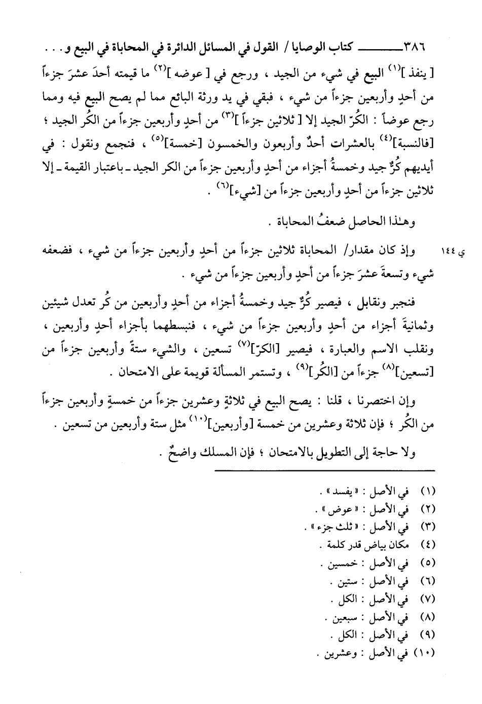 فنجبر ونقابل، فيصير كُرٌّ جيد وخمسةُ أجزاء من أحدٍ وأربعين من كُر تعدل شيئين وثمانيةَ أجزاء من أحدٍ وأربعين جزءاً من شيء، فنبسطهما بأجزاء أحدٍ وأربعين، ونقلب الاسم والعبارة، فيصير [الكرّ] (7) تسعين، والشيء ستةً وأربعين جزءاً من [تسعين] (8) جزءاً من [الكُر] (9)، وتستمر المسألة قويمة على الامتحان.