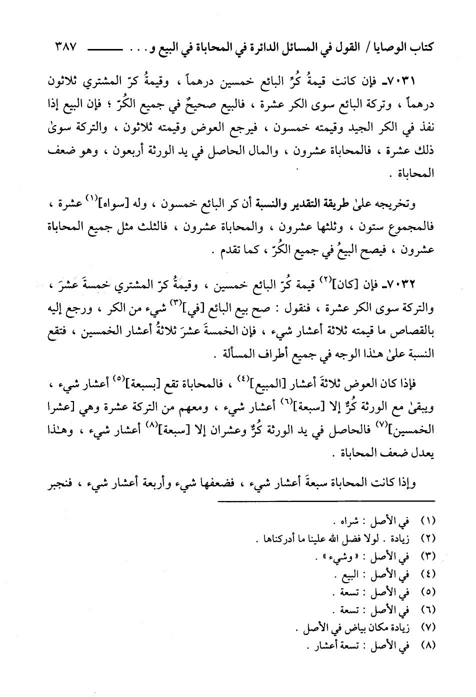 7031 - فإن كانت قيمةُ كُرِّ البائع خمسين درهماً، وقيمةُ كرّ المشتري ثلاثون درهماً، وتركة البائع سوى الكر عشرة، فالبيع صحيحٌ في جميع الكُرّ؛ فإن البيع إذا نفذ في الكر الجيد وقيمته خمسون، فيرجع العوض وقيمته ثلاثون، والتركة سوى ذلك عشرة، فالمحاباة عشرون، والمال الحاصل في يد الورثة أربعون، وهو ضعف المحاباة.