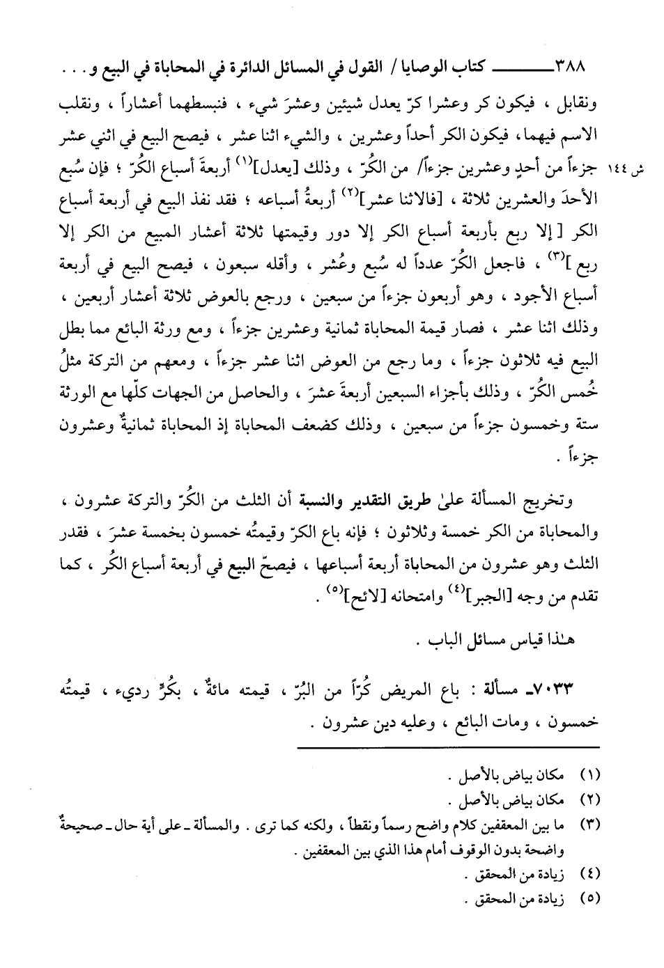 ونقابل، فيكون كر وعشرا كرّ يعدل شيئين وعشرَ شيء، فنبسطهما أعشاراً، ونقلب الاسم فيهما، فيكون الكر أحداً وعشرين، والشيء اثنا عشر، فيصح البيع في اثني عشر جزءاً من أحدٍ وعشرين جزءاً من الكُرّ، وذلك [يعدل] (1) أربعةَ أسباع الكُرّ؛ فإن سُبع الأحدَ والعشرين ثلاثة، [فالاثنا عشر] (2) أربعةُ أسباعه؛ فقد نفذ البيع في أربعة أسباع الكر [إلا ربع بأربعة أسباع الكر إلا دور وقيمتها ثلاثة أعشار المبيع من الكر إلا ربع] (3)، فاجعل الكُرّ عدداً له سُبع وعُشر، وأقله سبعون، فيصح البيع في أربعة أسباع الأجود، وهو أربعون جزءاً من سبعين، ورجع بالعوض ثلاثة أعشار أربعين، وذلك اثنا عشر، فصار قيمة المحاباة ثمانية وعشرين جزءاً، ومع ورثة البائع مما بطل البيع فيه ثلاثون جزءاً، وما رجع من العوض اثنا عشر جزءاً، ومعهم من التركة مثلُ خُمس الكُرّ، وذلك بأجزاء السبعين أربعةَ عشرَ، والحاصل من الجهات كلّها مع الورثة ستة وخمسون جزءاً من سبعين، وذلك كضعف المحاباة إذ المحاباة ثمانيةٌ وعشرون جزءاً.